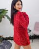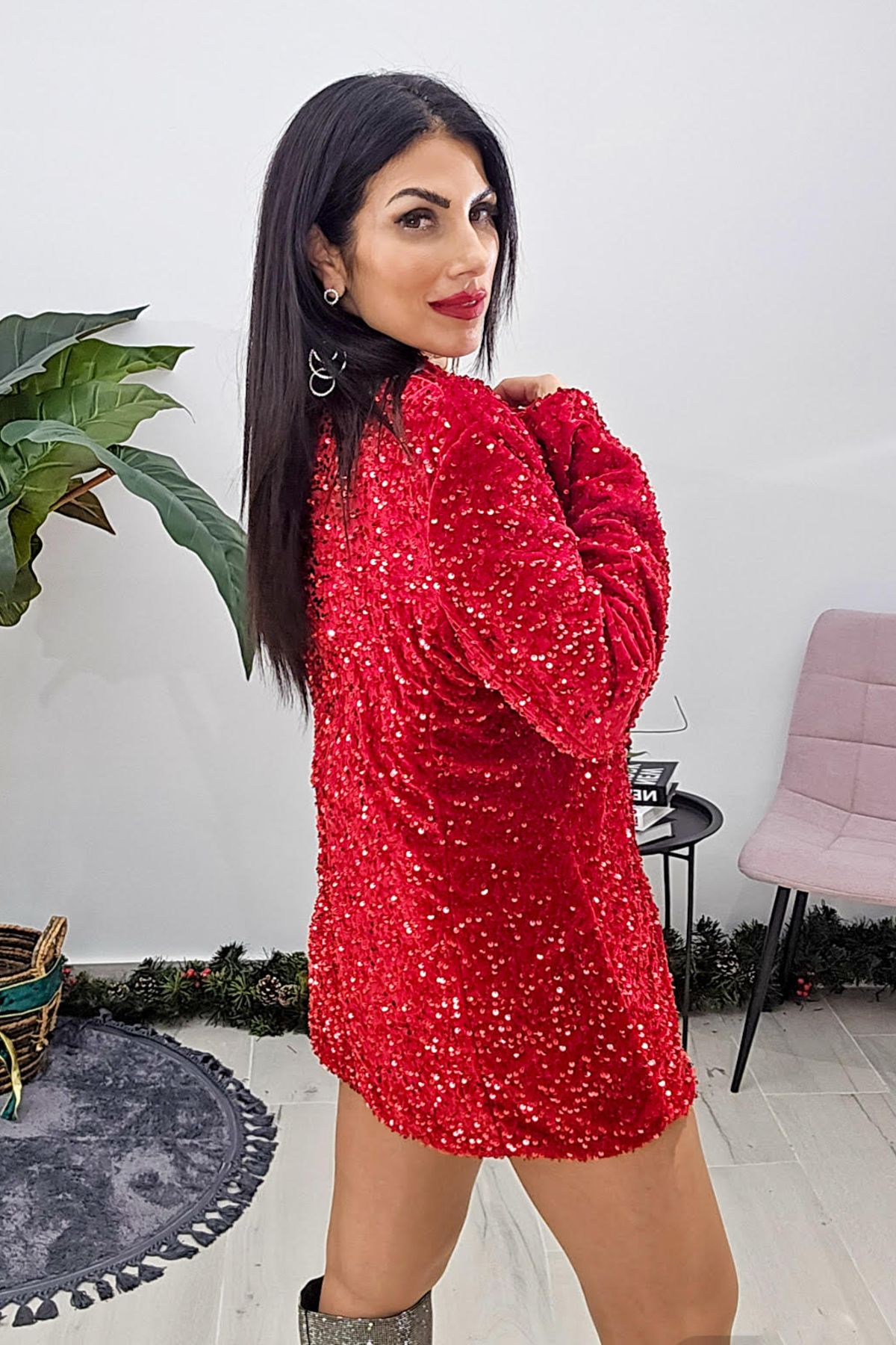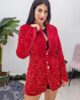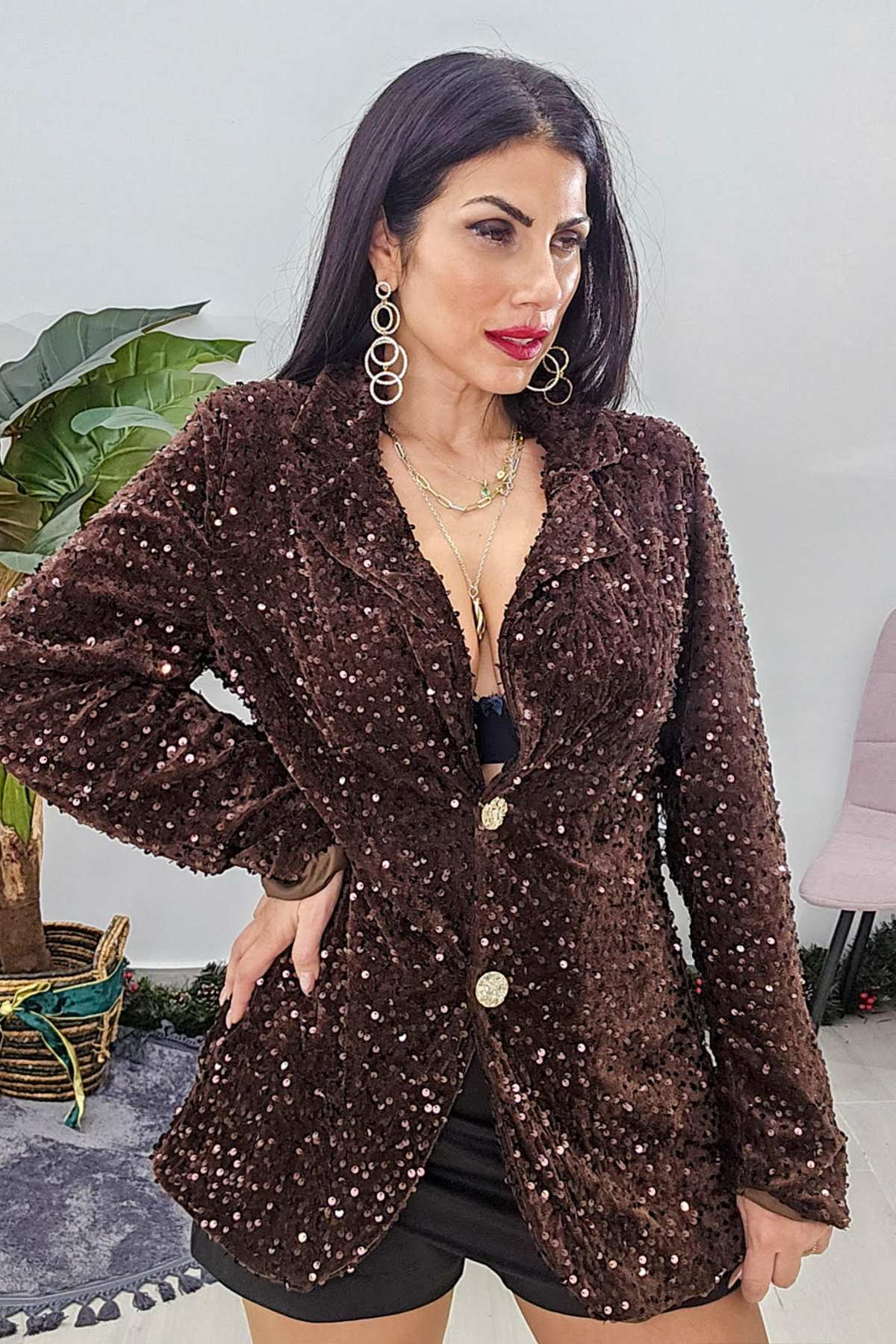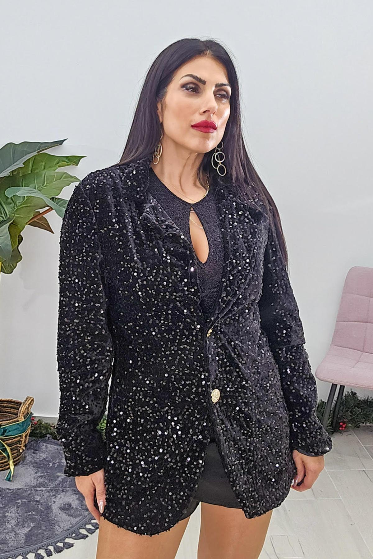 Σακάκι από ελαστικό βελούδινο ύφασμα με παγιέτα. Το σακάκι είναι μαλακό σε άνετη εφαρμογή, έχει γιακά , κουμπώνει με εντυπωσιακά χρυσά κουμπιά στο μπροστά μέρος και καλύπτει την περιφέρεια. Εσωτερικά έχει φόδρα.