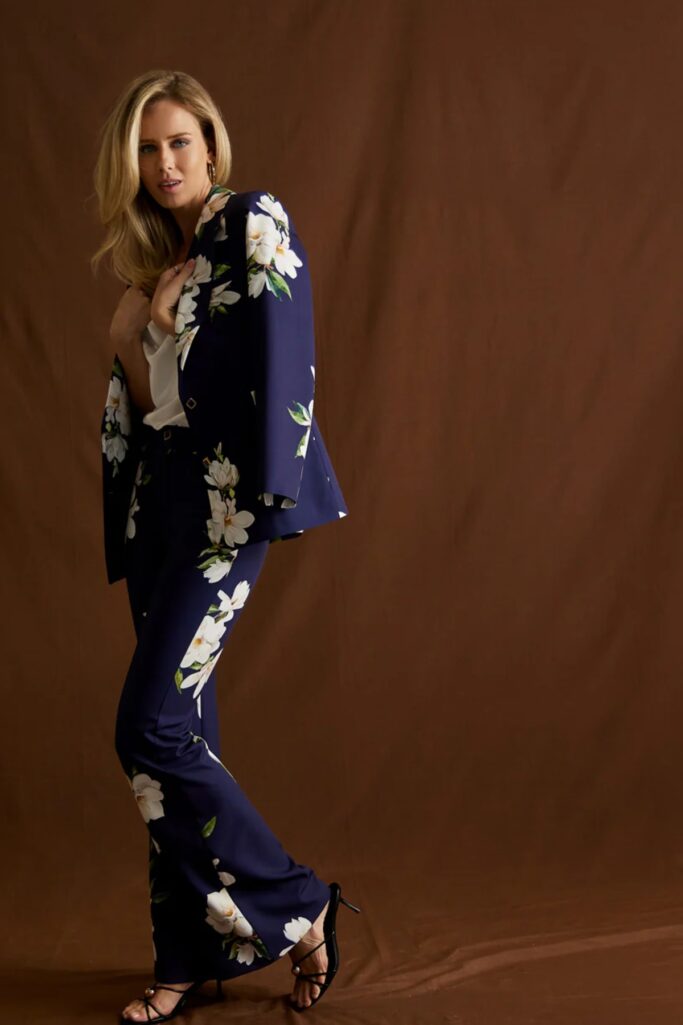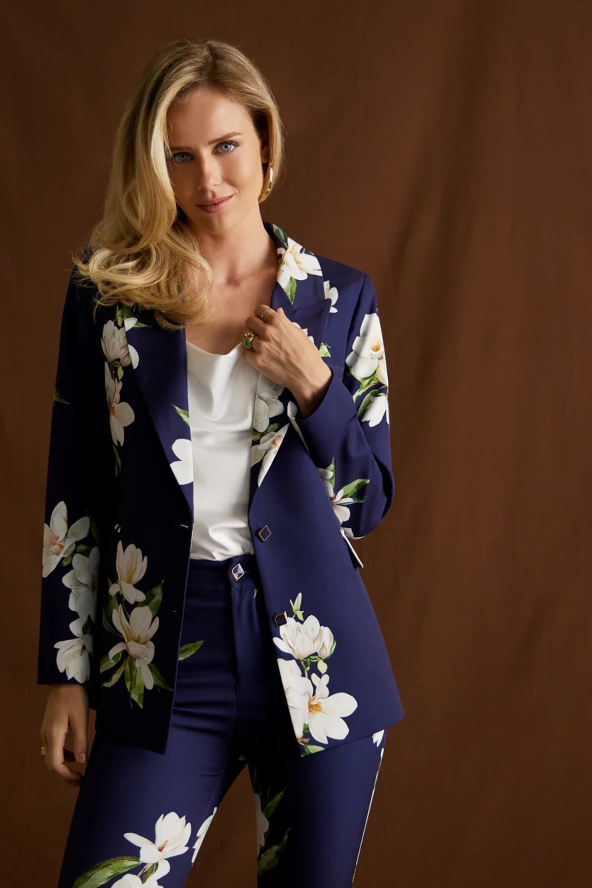 Σακάκι από σταθερό floral ύφασμα. Το σακάκι είναι σε άνετη εφαρμογή, μεσάτο και κουμπώνει μπροστά με εντυπωσιακά κουμπιά. Εσωτερικά έχει φόδρα και τετράγωνες τσέπες με καπάκι. Το προϊόν είναι ελληνικής εταιρείας.