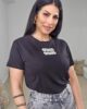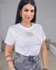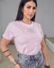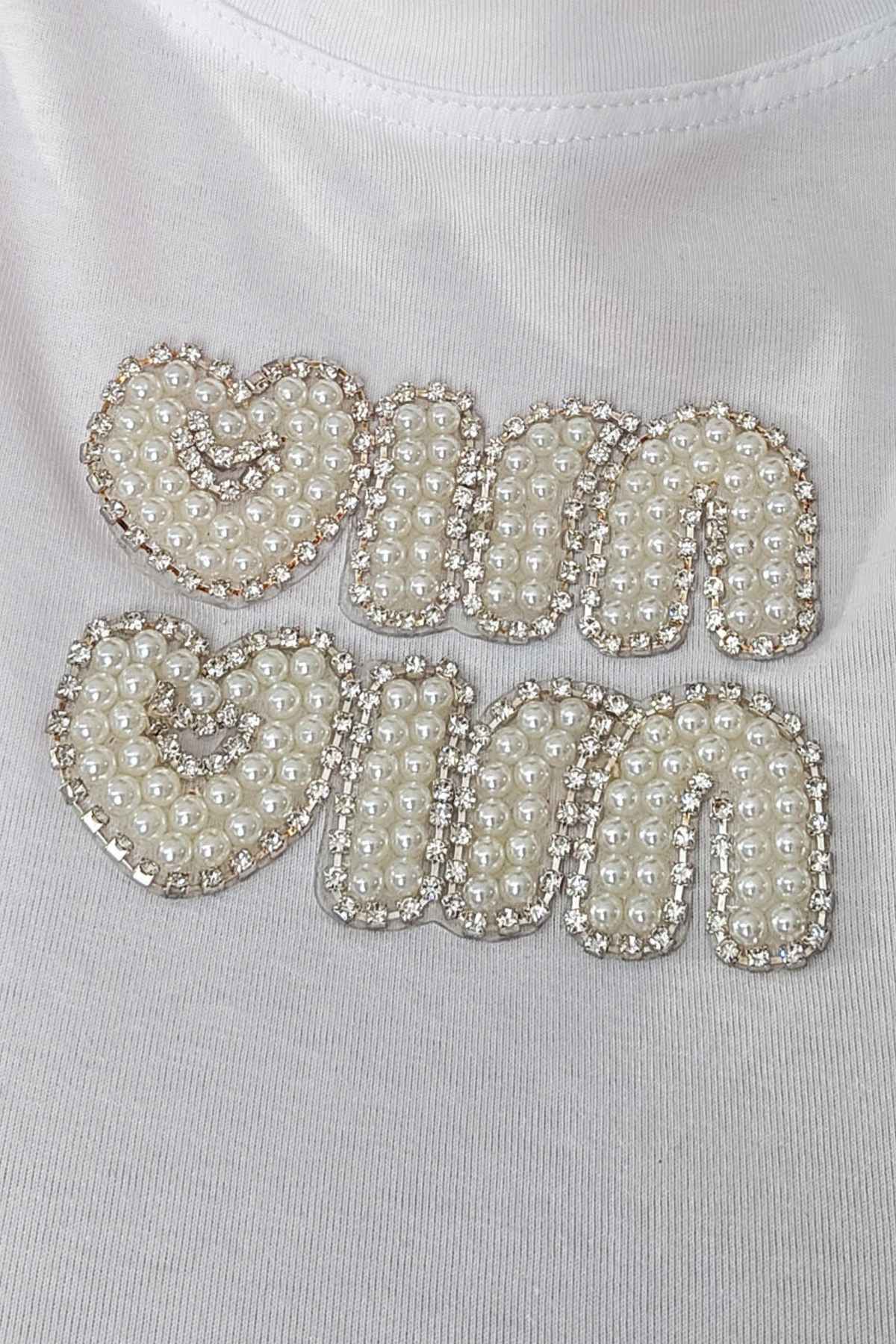 Top από ελαστικό βαμβακερό ύφασμα. Το μπλουζάκι είναι σε άνετη εφαρμογή, έχει κλειστή λαιμόκοψη, κοντό μανίκι και λεπτομέρεια με στάμπα ανάγλυφη από πέρλες και strass στο στέρνο.