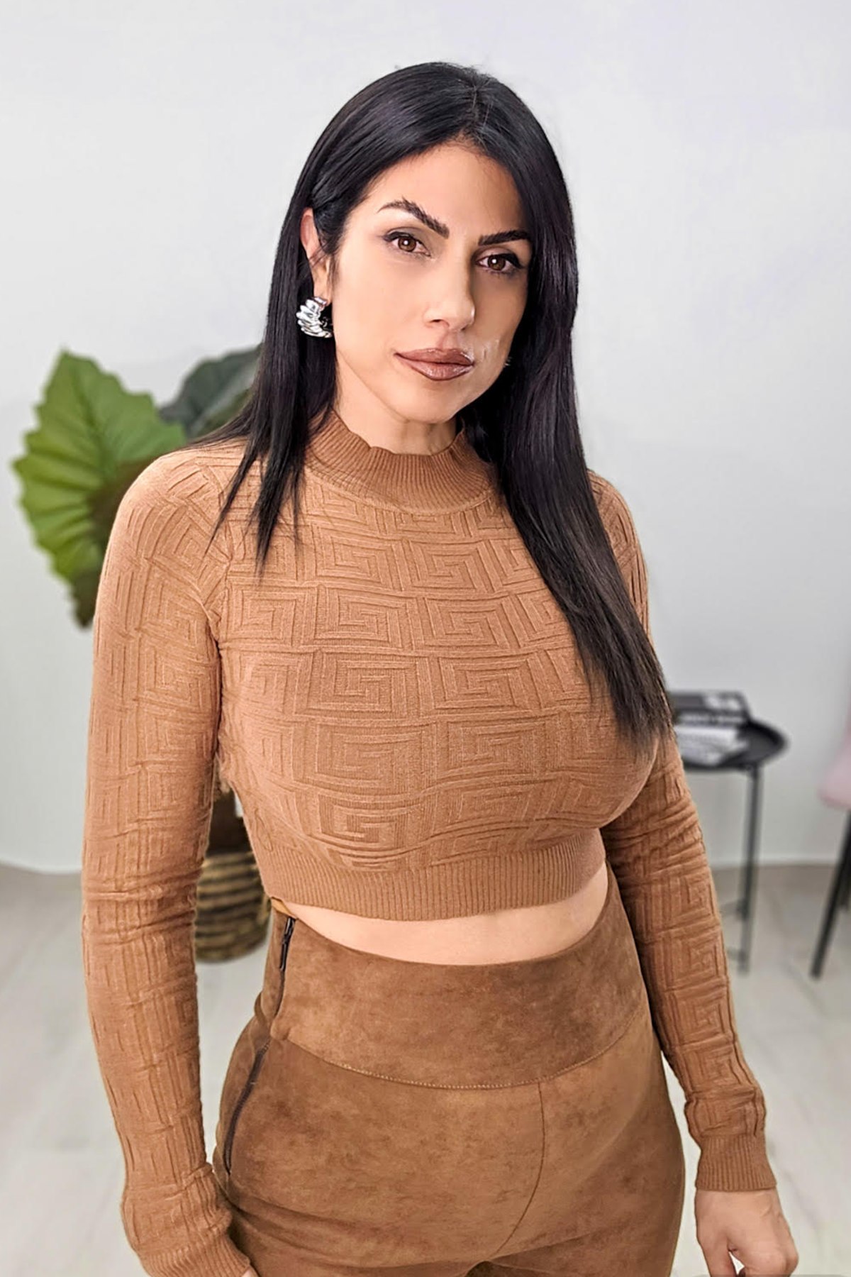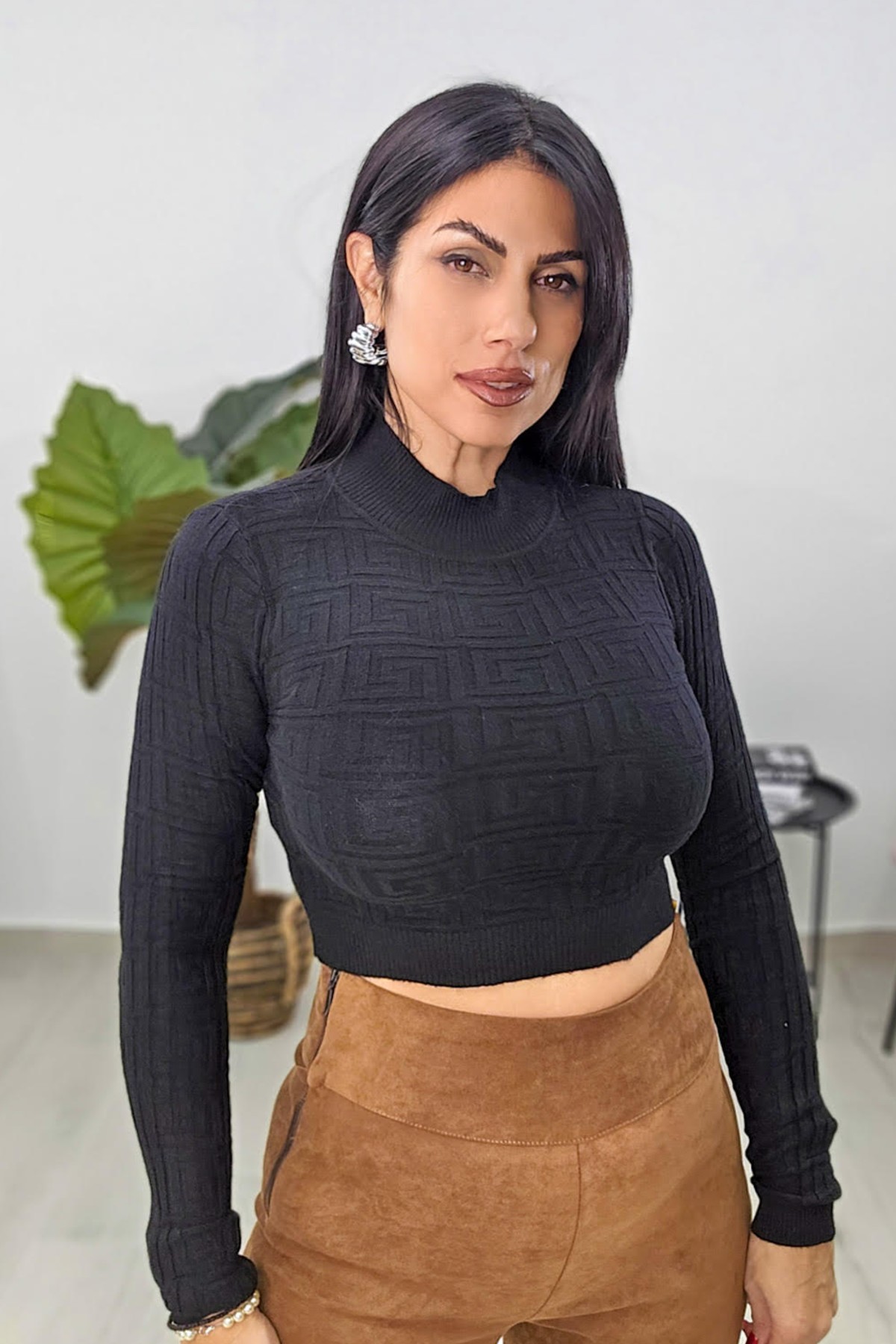 Top από ελαστική πλεκτή βισκόζη. Το μπλουζάκι έχει άνετη εφαρμογή, μακρύ μανίκι και κλειστή λαιμόκοψη. Έχει σχέδιο με ιδιαίτερη πλέξη από μαιάνδρους.