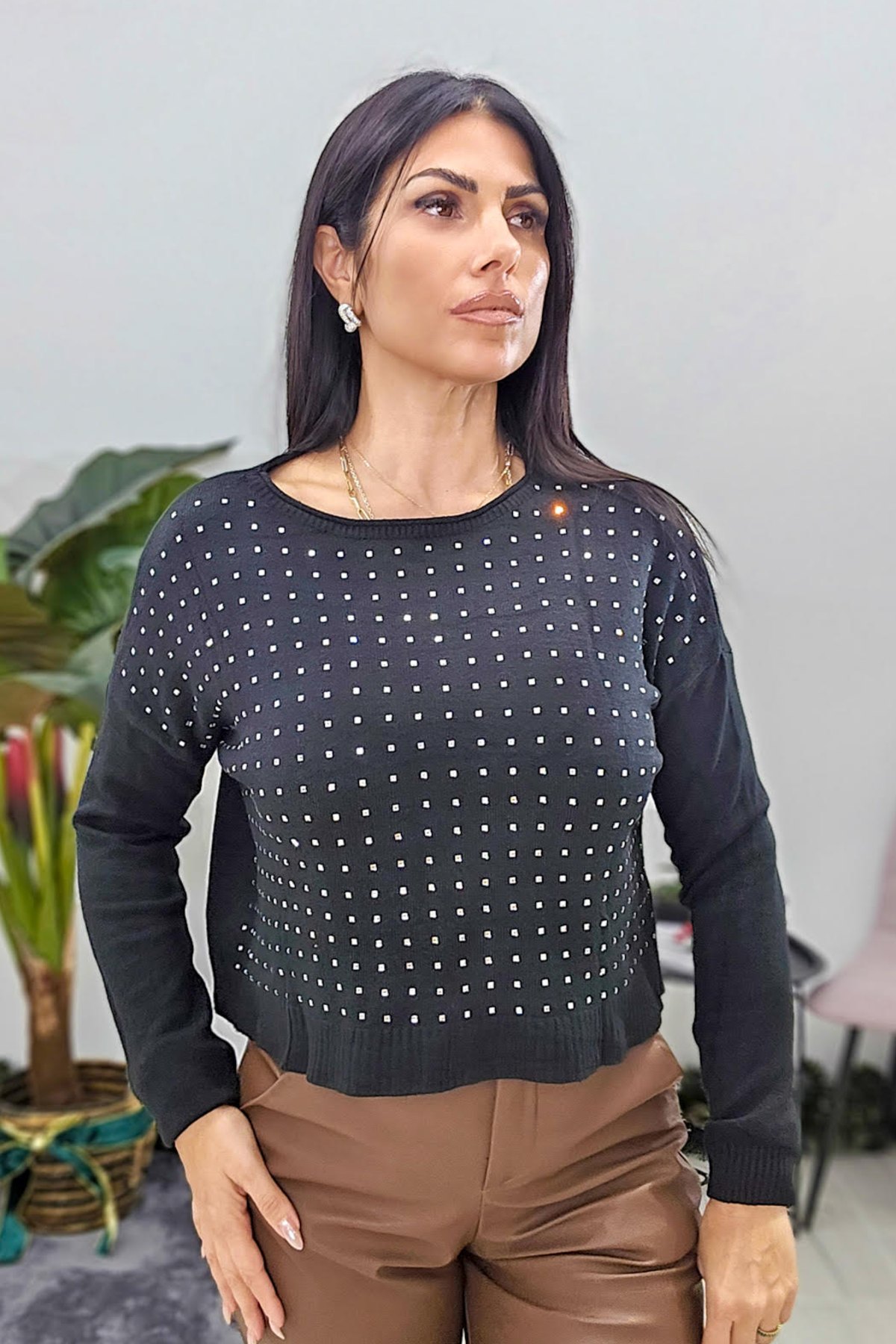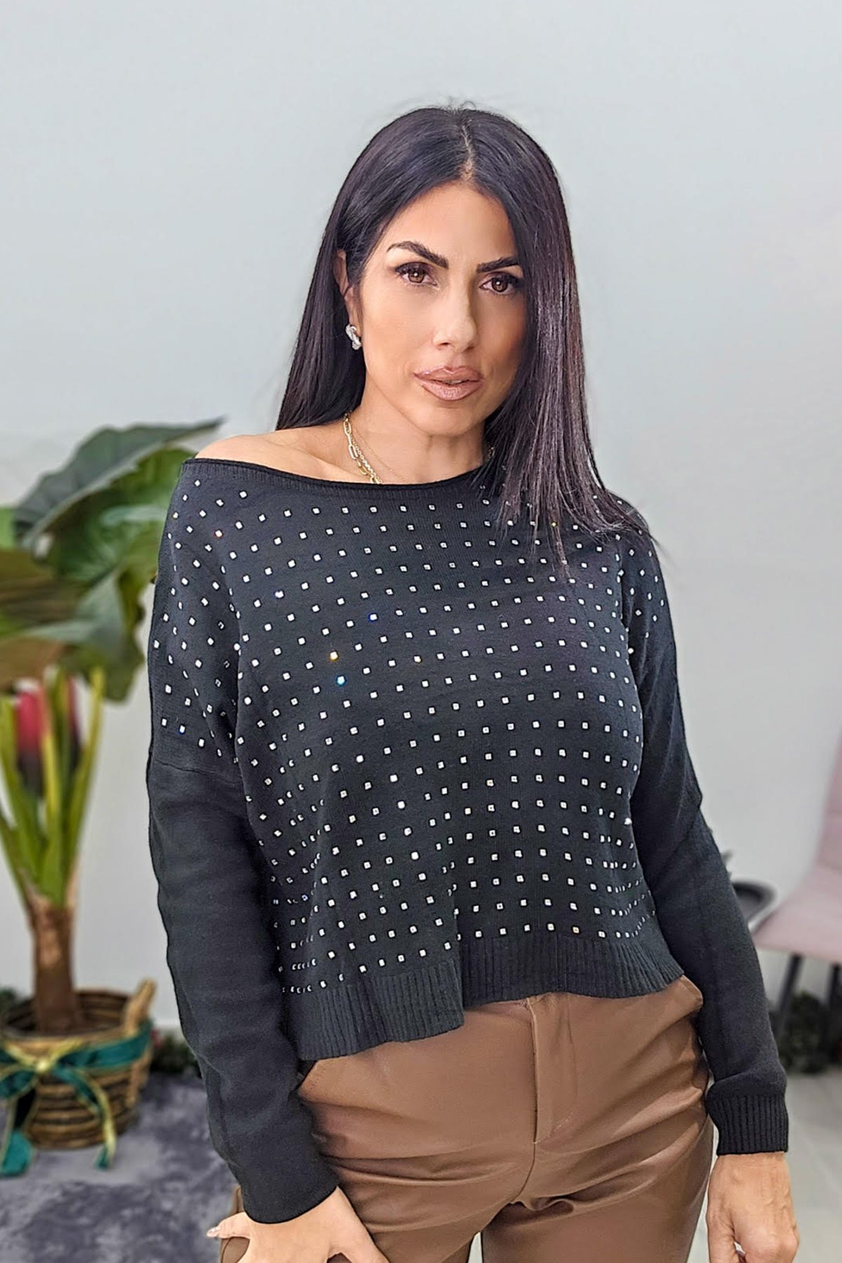Top από ελαστικό πλεκτό ύφασμα με βισκόζη. Το πλεκτό είναι σε άνετη εφαρμογή με λεπτομέρειες στρας που λάμπουν στο μπροστά μέρος και λάστιχο ανάλαφρο στο τελείωμα.