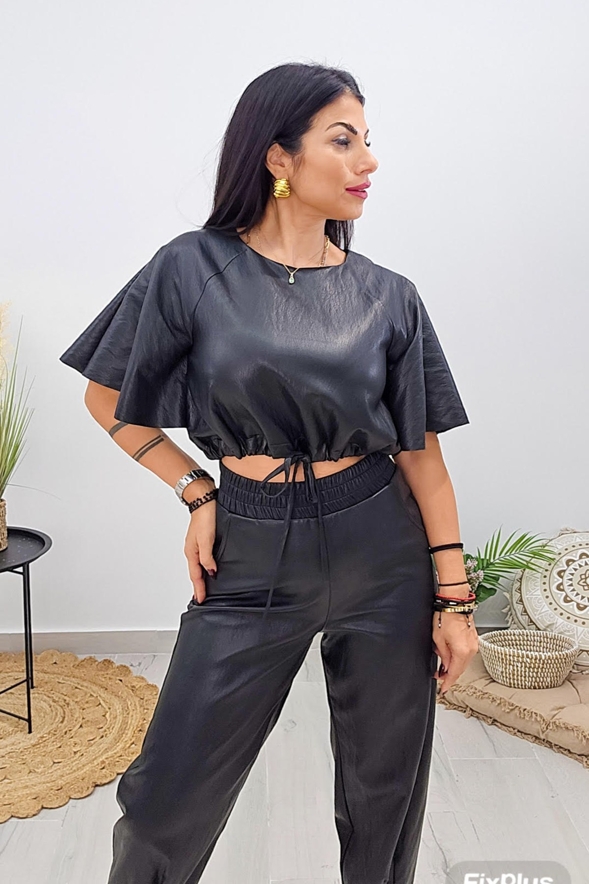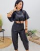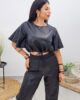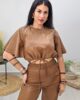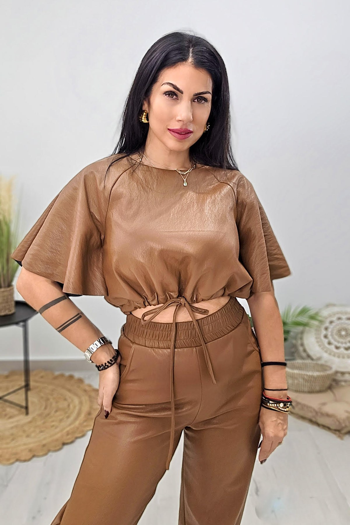 Τοπ από σταθερή δερματίνη. Το μπλουζάκι είναι κοντό, άνετο, με κορδόνι στην μέση που σφίγγει και ρυθμίζεται, έχει κλειστή λαιμόκοψη και άνετο μανίκι μέχρι τον αγκώνα. Το προϊόν είναι ελληνικής εταιρείας.