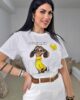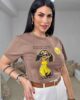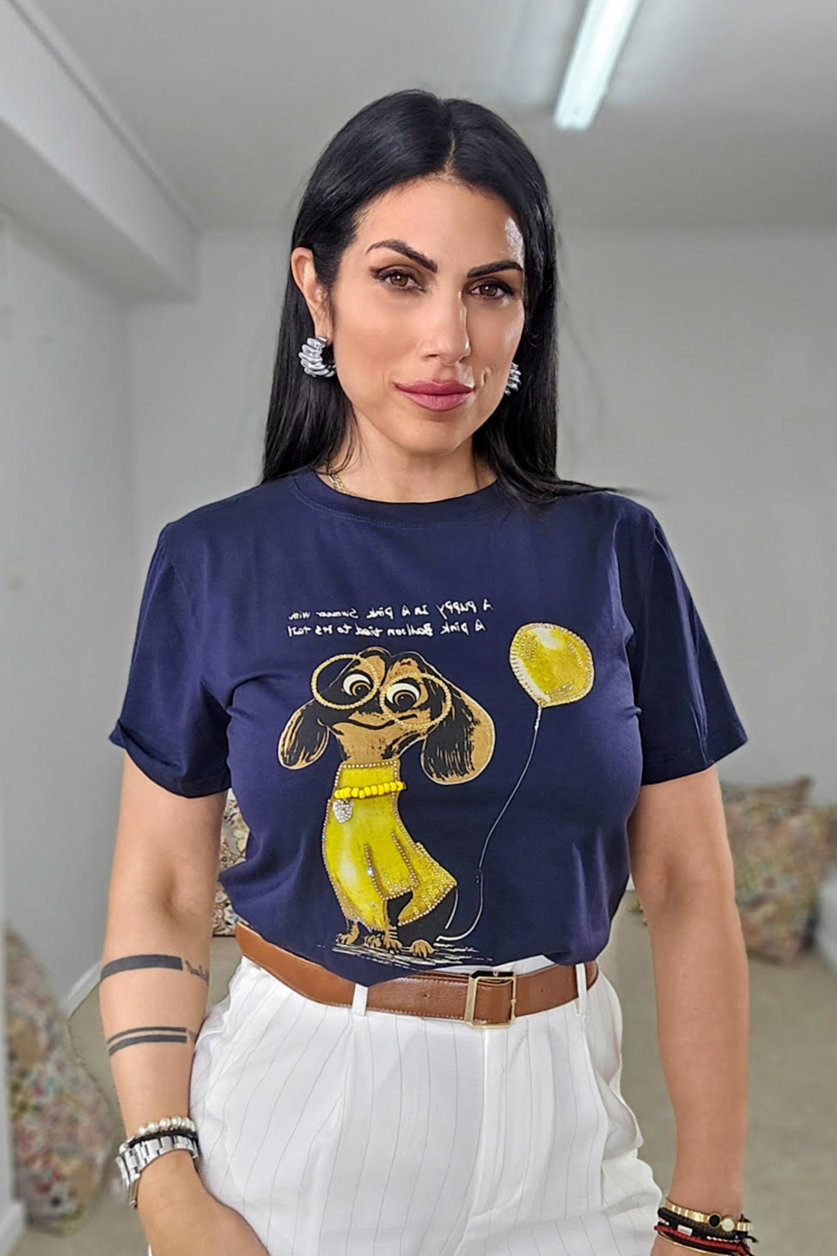 Top από ελαστικό βαμβακερό ύφασμα. Το μπλουζάκι είναι σε άνετη εφαρμογή, με κοντό μανίκι, κλειστή λαιμόκοψη, στάμπα μπροστά και strass εντυπωσιακά που το κάνουν πιο ιδιαίτερο.