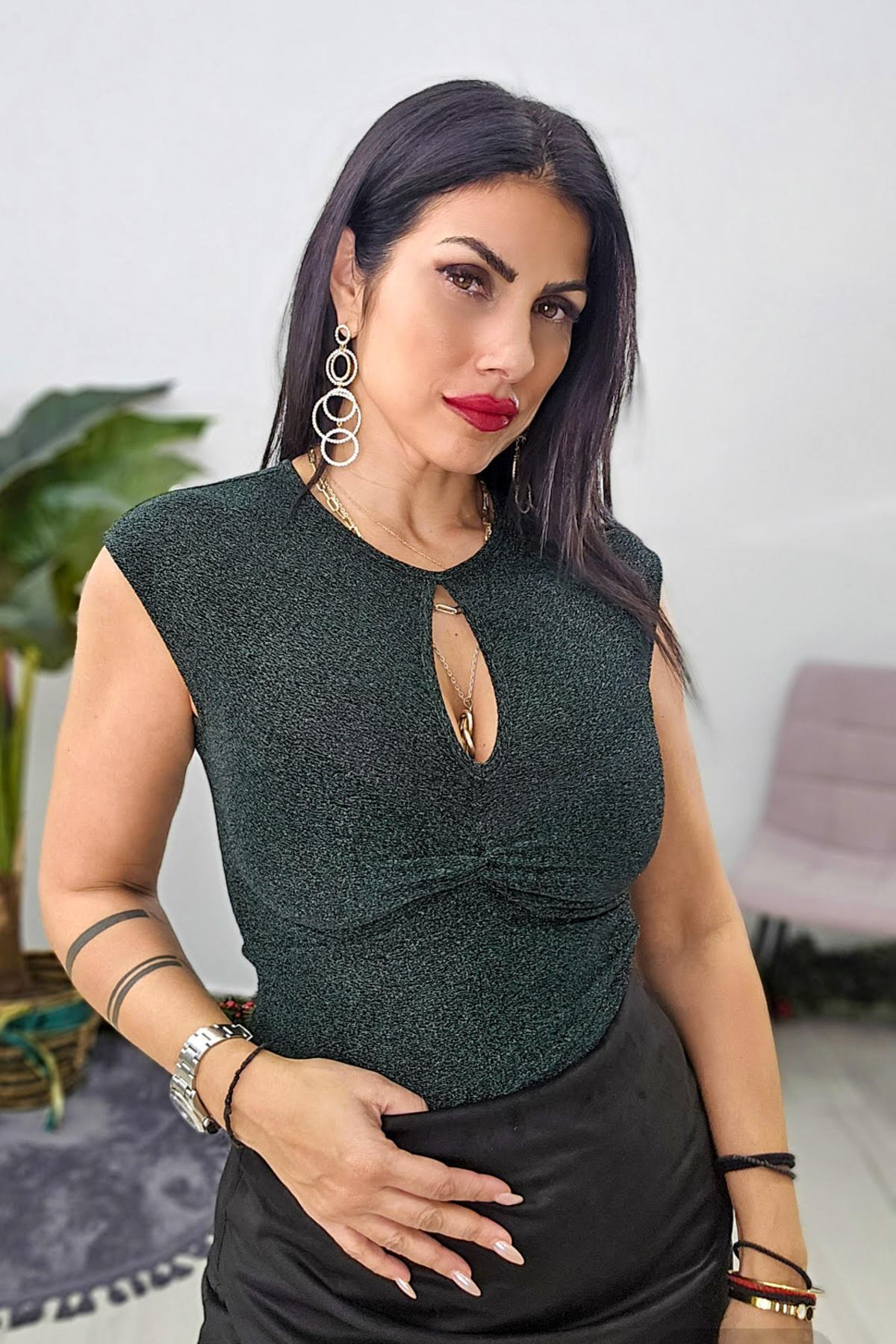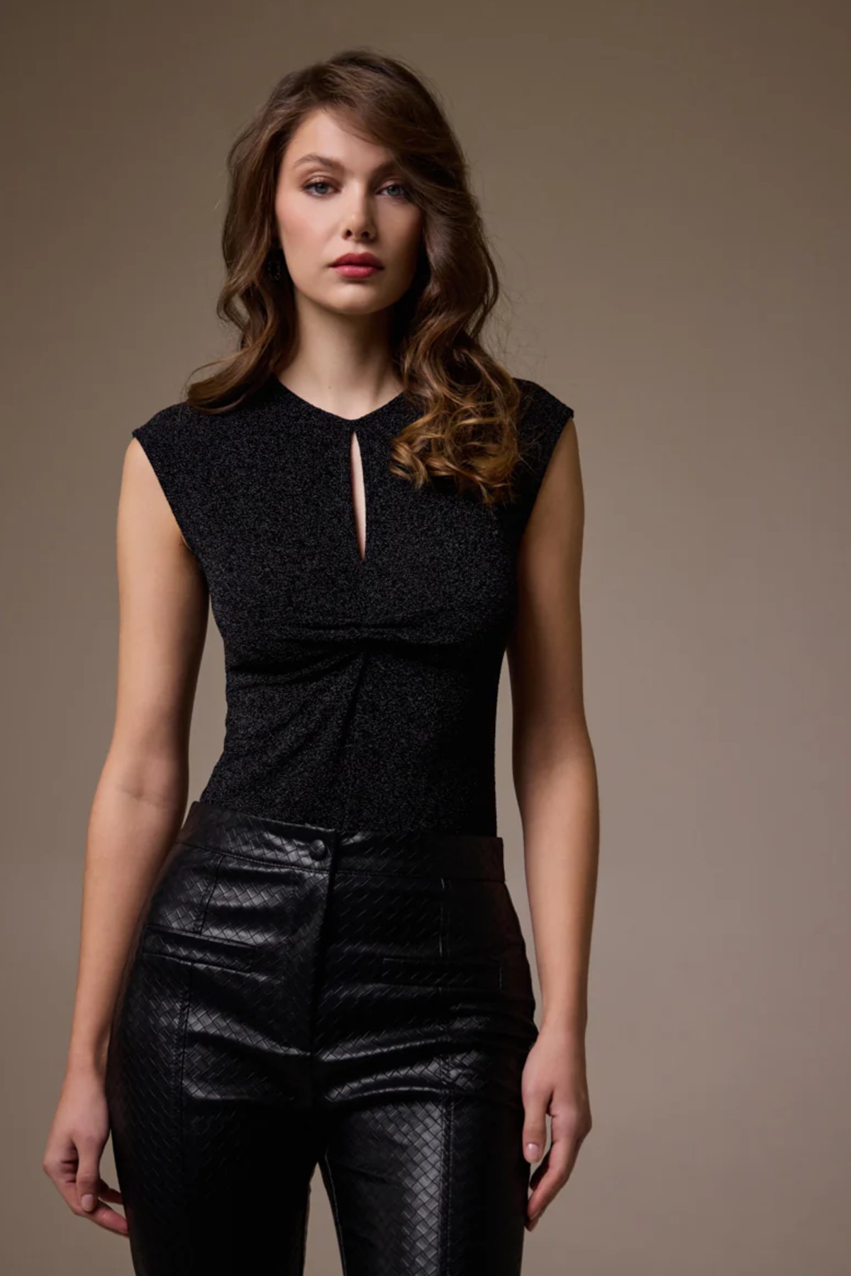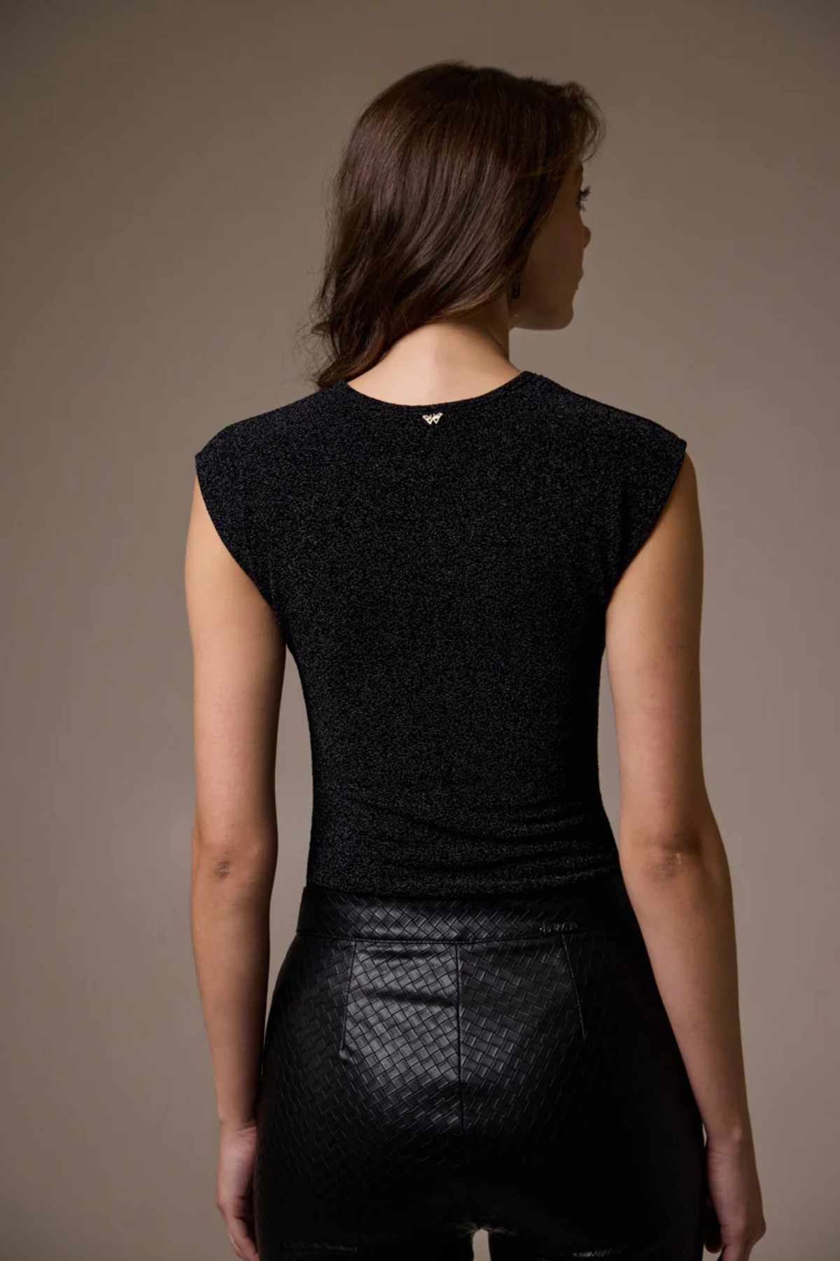 Κορμάκι από ελαστικό lurex ύφασμα. Το κορμάκι είναι αμάνικο σε άνετη εφαρμογή, έχει σχέδιο με άνοιγμα και σούρες μπροστά. Το προιόν είναι ελληνικής εταιρείας.