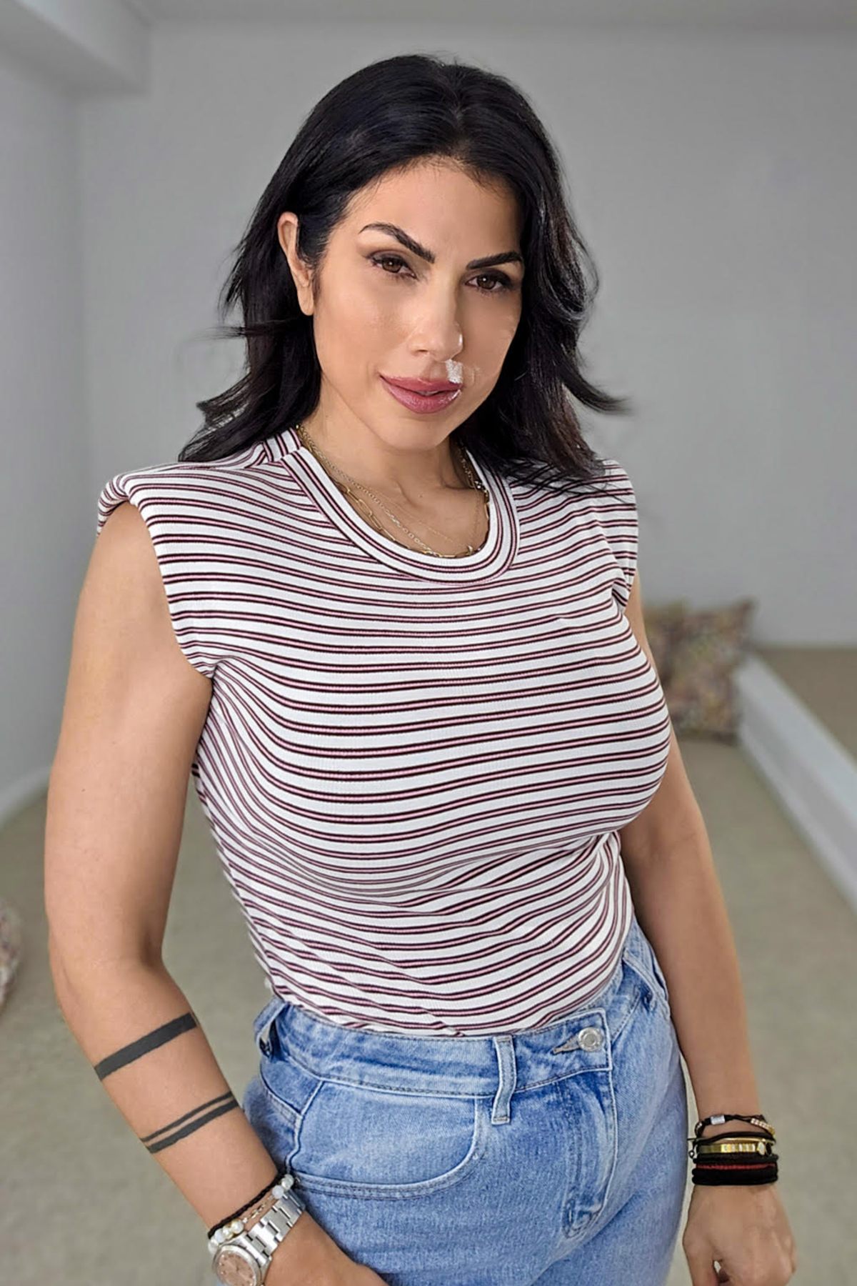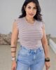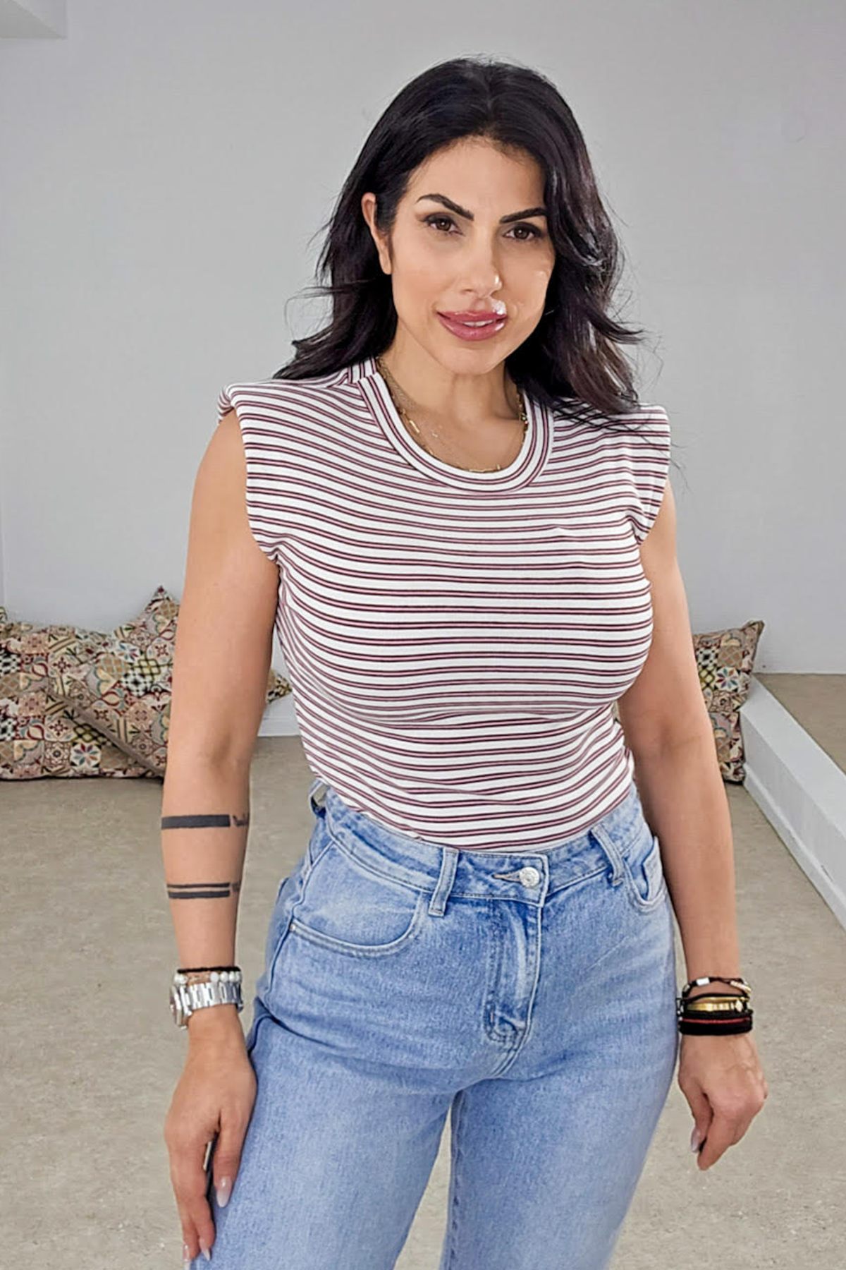 Top από ελαστικό ριπ ριγέ ύφασμα. Το μπλουζάκι είναι σε άνετη εφαρμογή, αμάνικο με βάτες στους ώμους.