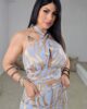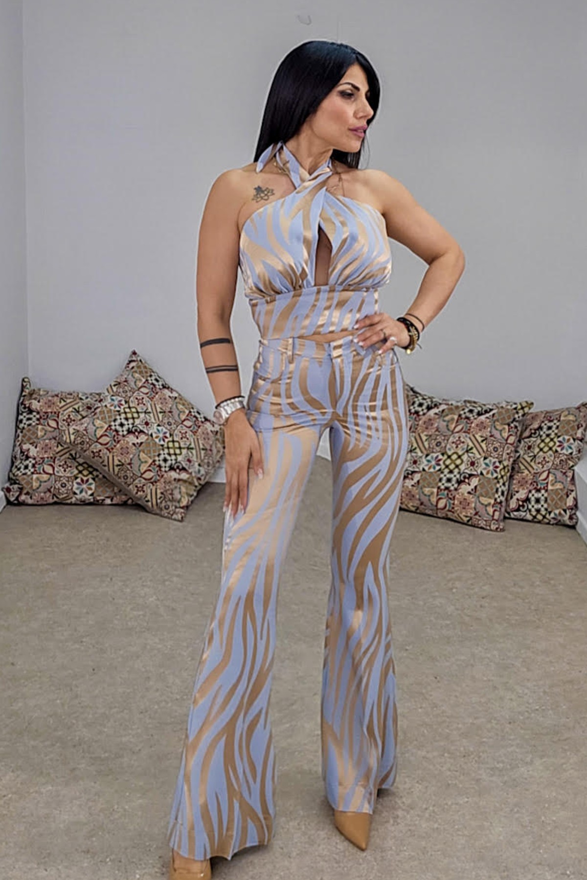 Top από σταθερό εμπριμέ σατέν ύφασμα. Το μπλουζάκι είναι σε άνετη εφαρμογή, πολυμορφικό με σφιγγοφωλιά στην πλάτη και δέσιμο πίσω από τον λαιμό. Το προιόν είναι ελληνικής εταιρείας.