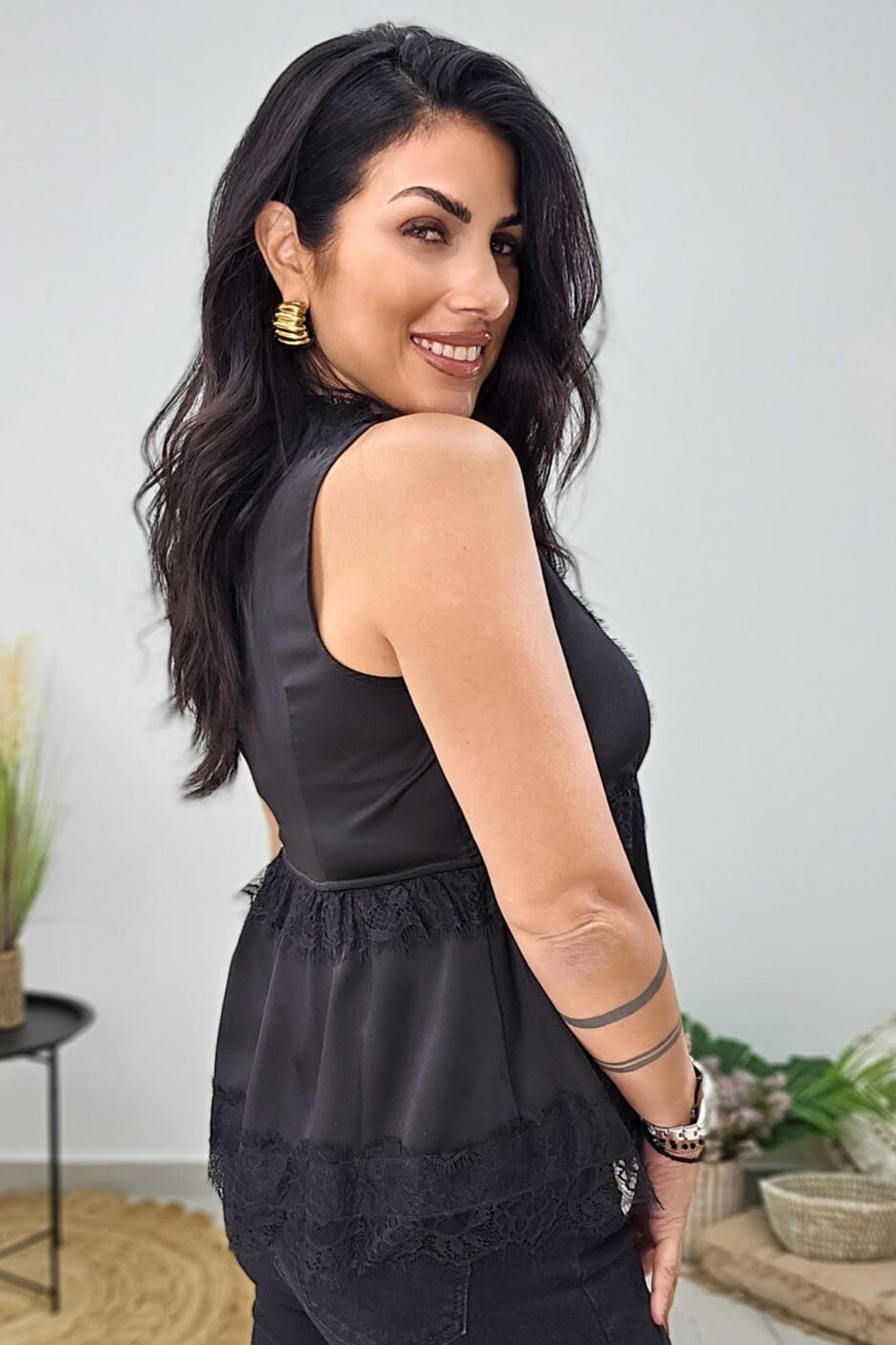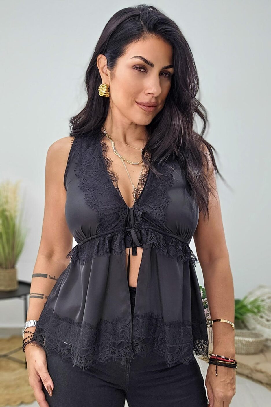 Τop από σταθερό σατέν ύφασμα με λεπτομέρειες σε δαντέλα. Το τοπ είναι σε άνετη γραμμή ,δένει μπροστά με κορδόνια είναι μεσάτο και αμάνικο. Το προϊόν είναι ελληνικής εταιρείας.