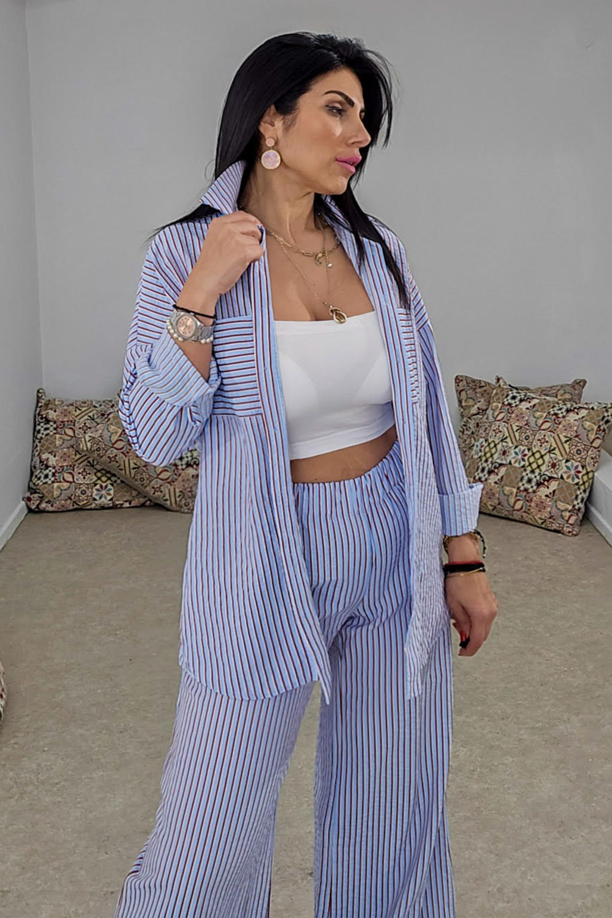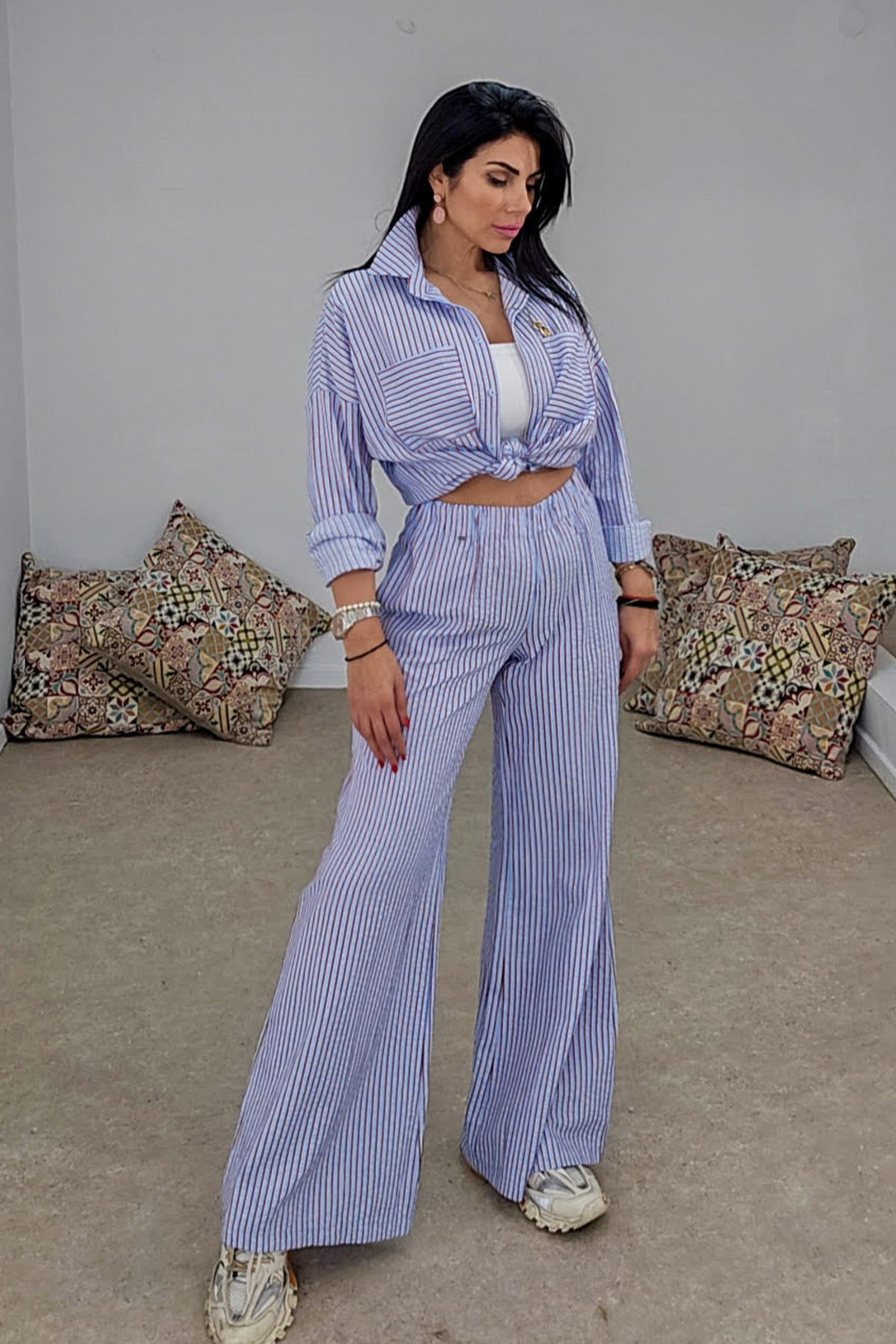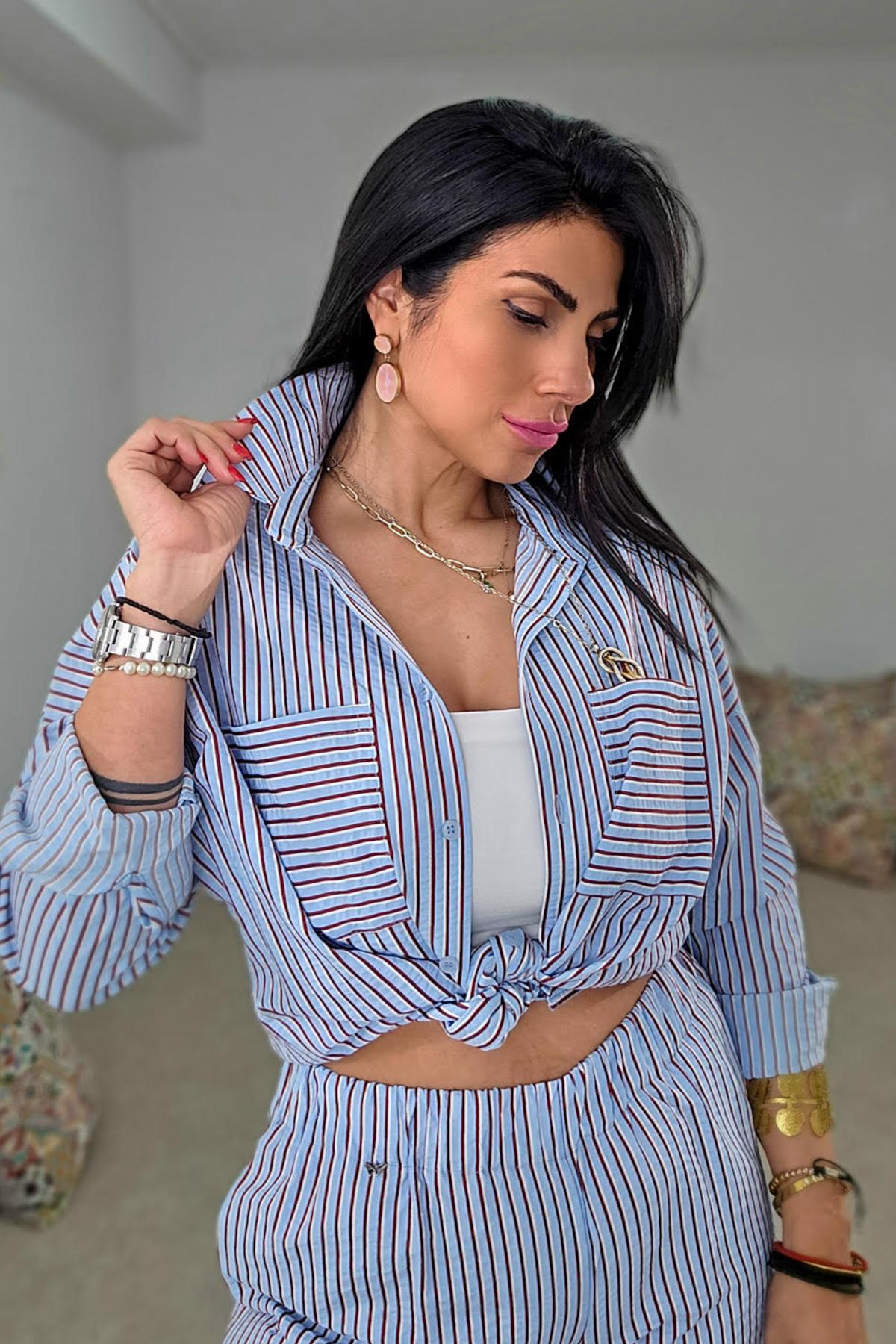 Πουκαμίσα από σταθερό βαμβακερό ριγέ ύφασμα. Το πουκάμισο είναι σε άνετη εφαρμογή με μακρύ μανίκι, κουμπώνει μπροστά με κουμπιά και έχει μεγάλες εντυπωσιακές τσέπες στο μπούστο. Το χρώμα είναι γαλάζιο με ρίγα λευκή και κόκκινη. Το προιόν είναι ελληνικής εταιρείας.