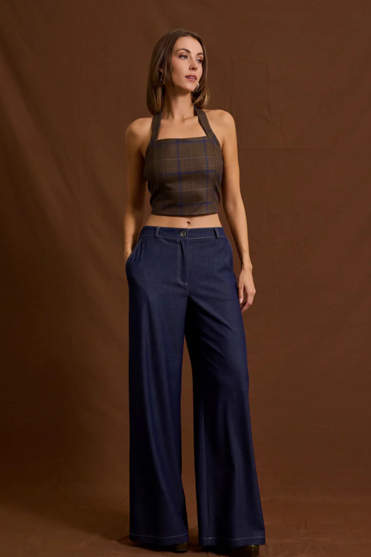 Μπούστο από σταθερό καρό ύφασμα. Το μπούστο είναι σε άνετη εφαρμογή, περνάει πίσω από τον λαιμό και κουμπώνει με φερμουάρ στην πλάτη. Το προϊόν είναι ελληνικής εταιρείας.