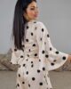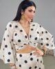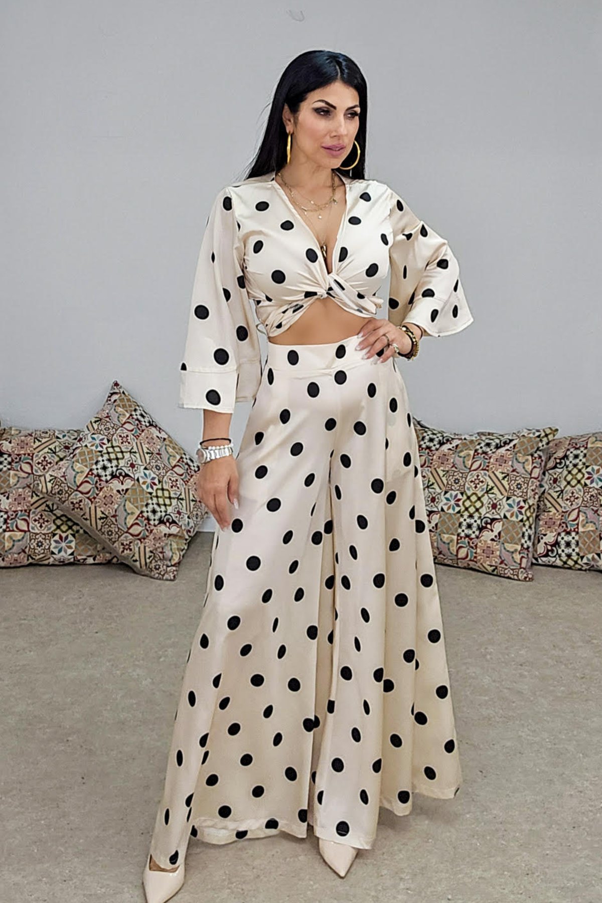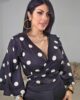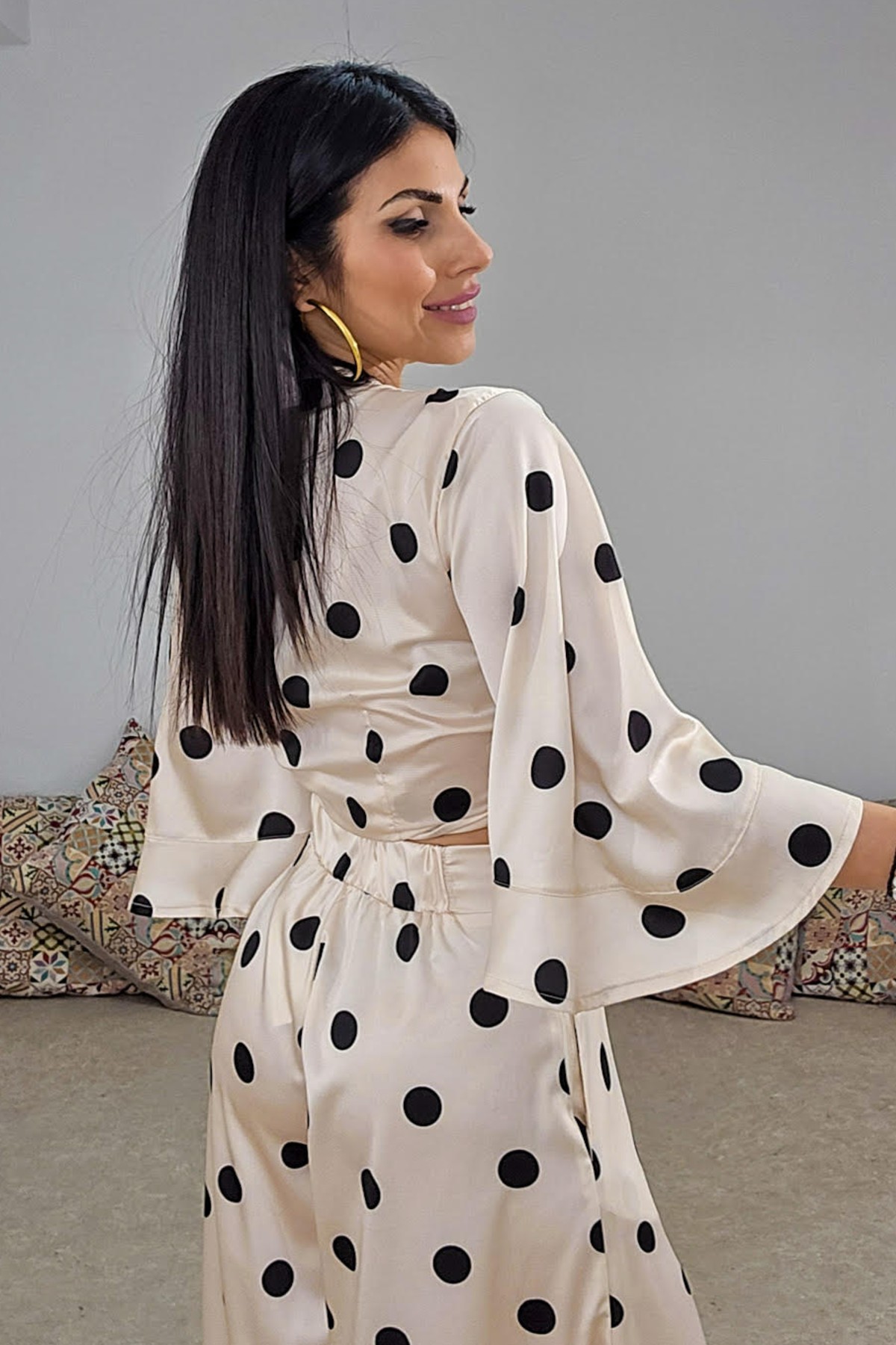Τοπ από σταθερό πουά σατέν ύφασμα. Το μπλουζάκι είναι κρουαζέ και πολυμορφικό, αγκαλιάζει το σώμα και δένει πίσω. Έχει μεγάλα εντυπωσιακά μανίκια και άνετη εφαρμογή. Το προϊόν είναι ελληνικής εταιρείας.