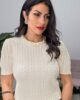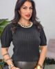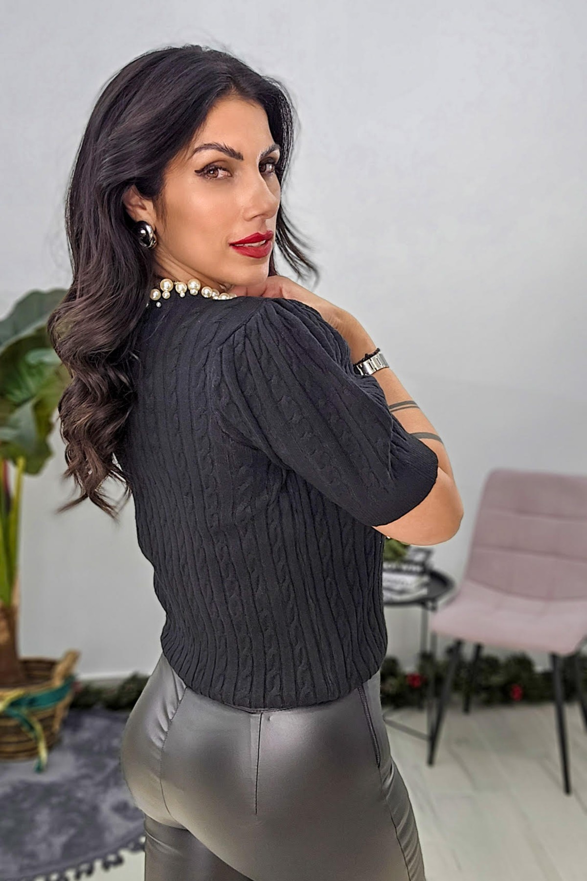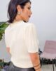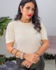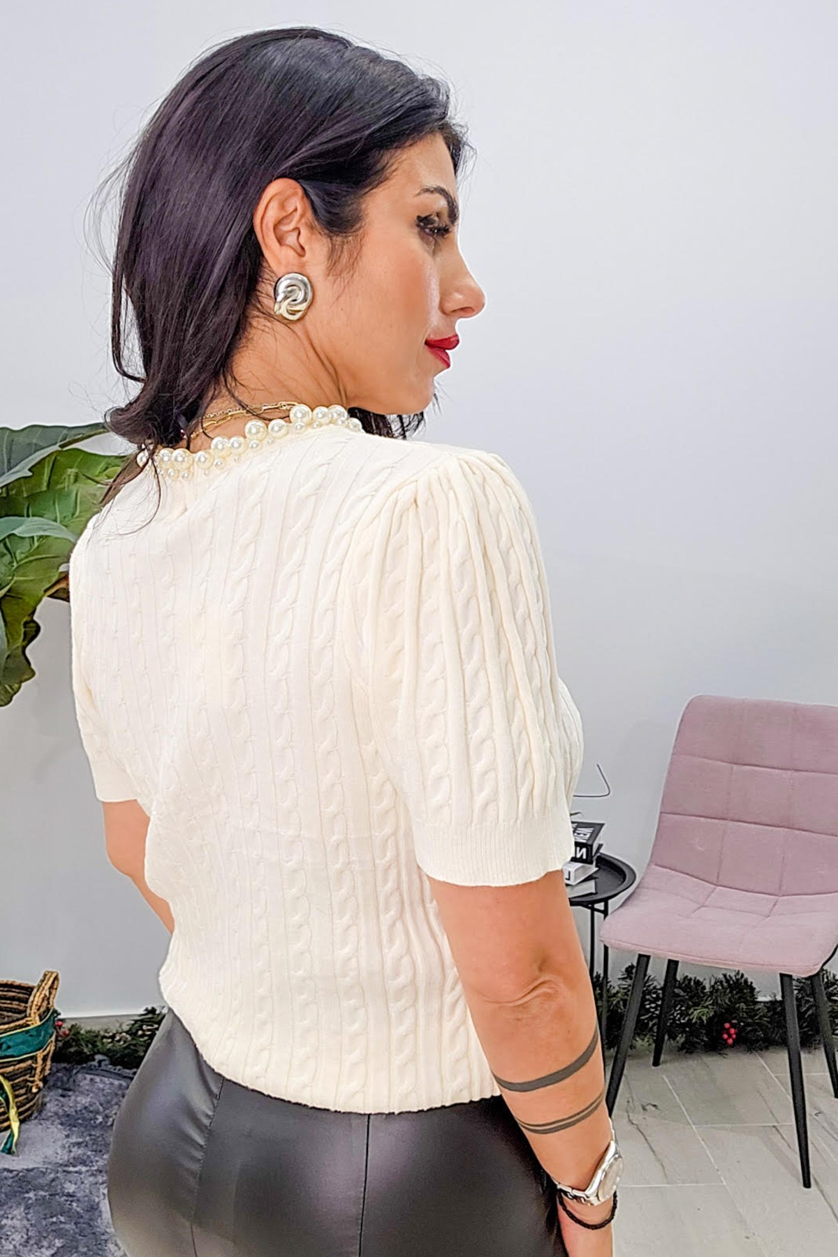 Πλεκτό από ελαστική βισκόζη. Το πλεκτό είναι σε άνετη εφαρμογή με κοντό ρομαντικό μανίκι ιδιαίτερη πλέξη και λεπτομέρεια με πέρλες στον λαιμό.