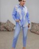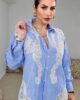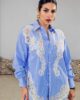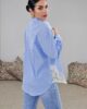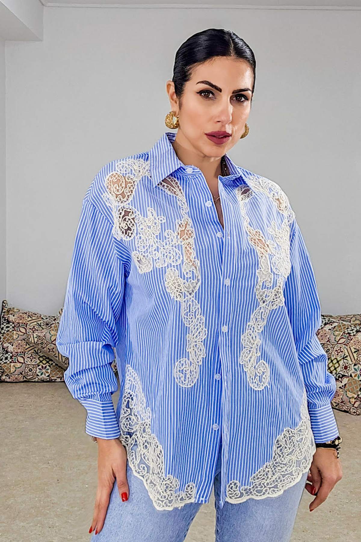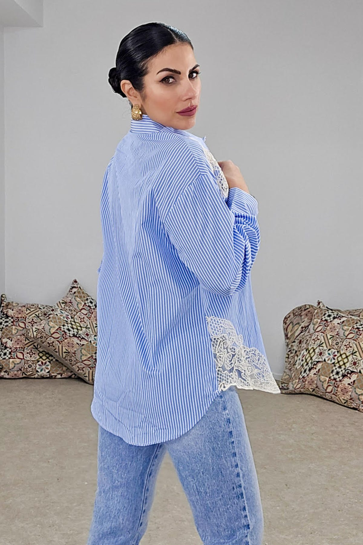 Πουκαμίσα από σταθερή ριγέ ποπλίνα. Η πουκαμίσα είναι σε άνετη εφαρμογή με σχέδιο δαντέλα μπροστά, κουμπώνει με κουμπιά, έχει μακρύ μανίκι που κλείνει με κουμπί στην μανσέτα και είναι ασύμμετρη.