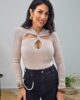 Top από ελαστική πλεκτή βισκόζη. Το μπλουζάκι είναι σε στενή εφαρμογή πάνω στο σώμα, έχει σχέδιο με πλεξίδες, ανοιχτό ντεκολτέ που αφήνει έξω τους ώμους και μακρύ μανίκι.