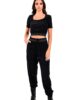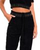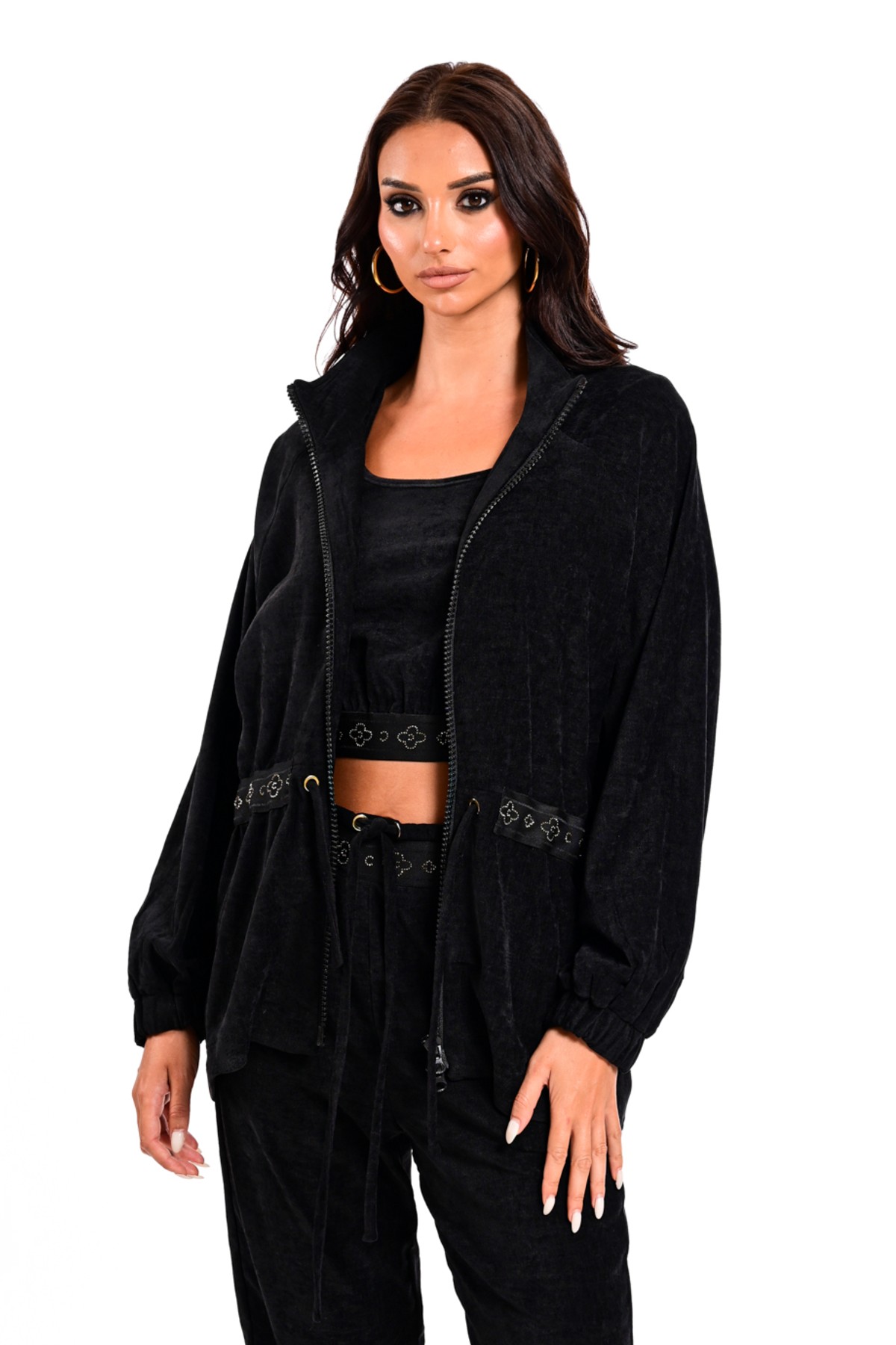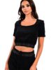 Top crop από ελαστικό βελούδινο ύφασμα. Το μπλουζάκι έχει κοντό μανίκι, κλειστή λαιμόκοψη και ζώνη ελαστική στην μέση που έχει μεταλλικές χρυσές λεπτομέρειες. Το προϊόν είναι ελληνικής εταιρείας.