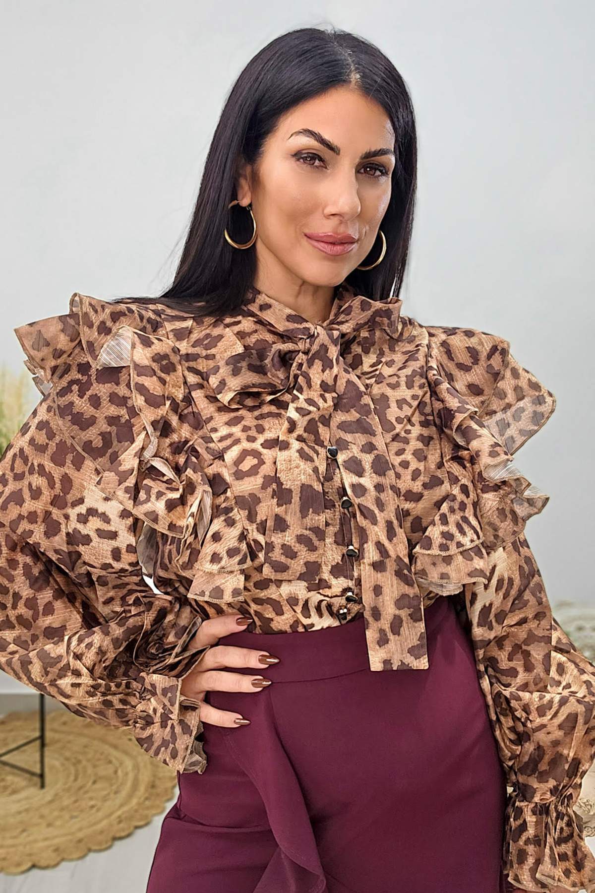 Πουκάμισο από σταθερή βισκόζη. Το πουκάμισο είναι σε άνετη εφαρμογή, έχει βολάν ,καταλήγει σε λάστιχο στα μανίκια, κουμπώνει με κουμπιά σε σχήμα καρδιάς και έχει γραβάτα από το ίδιο ύφασμα.