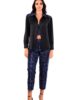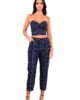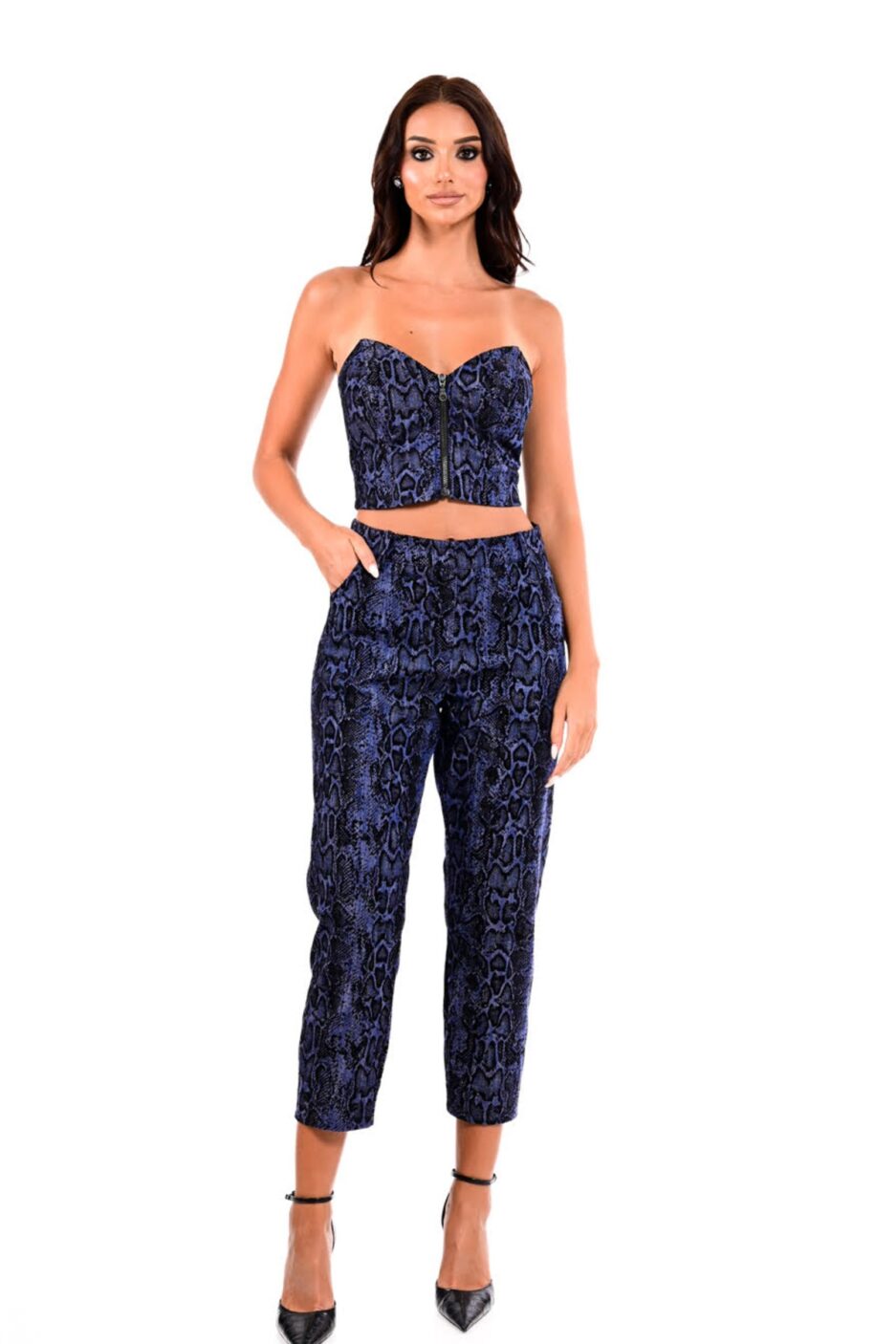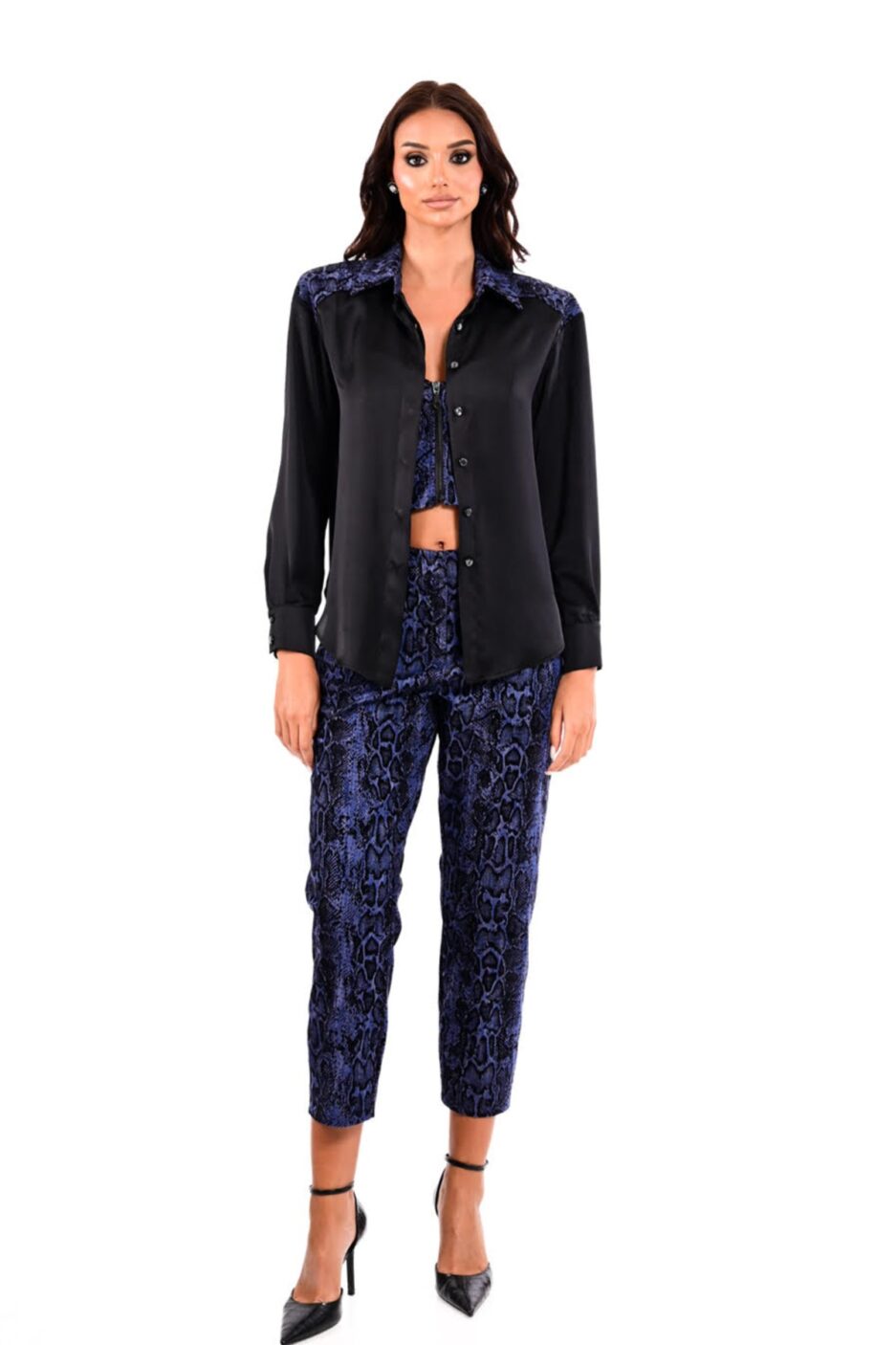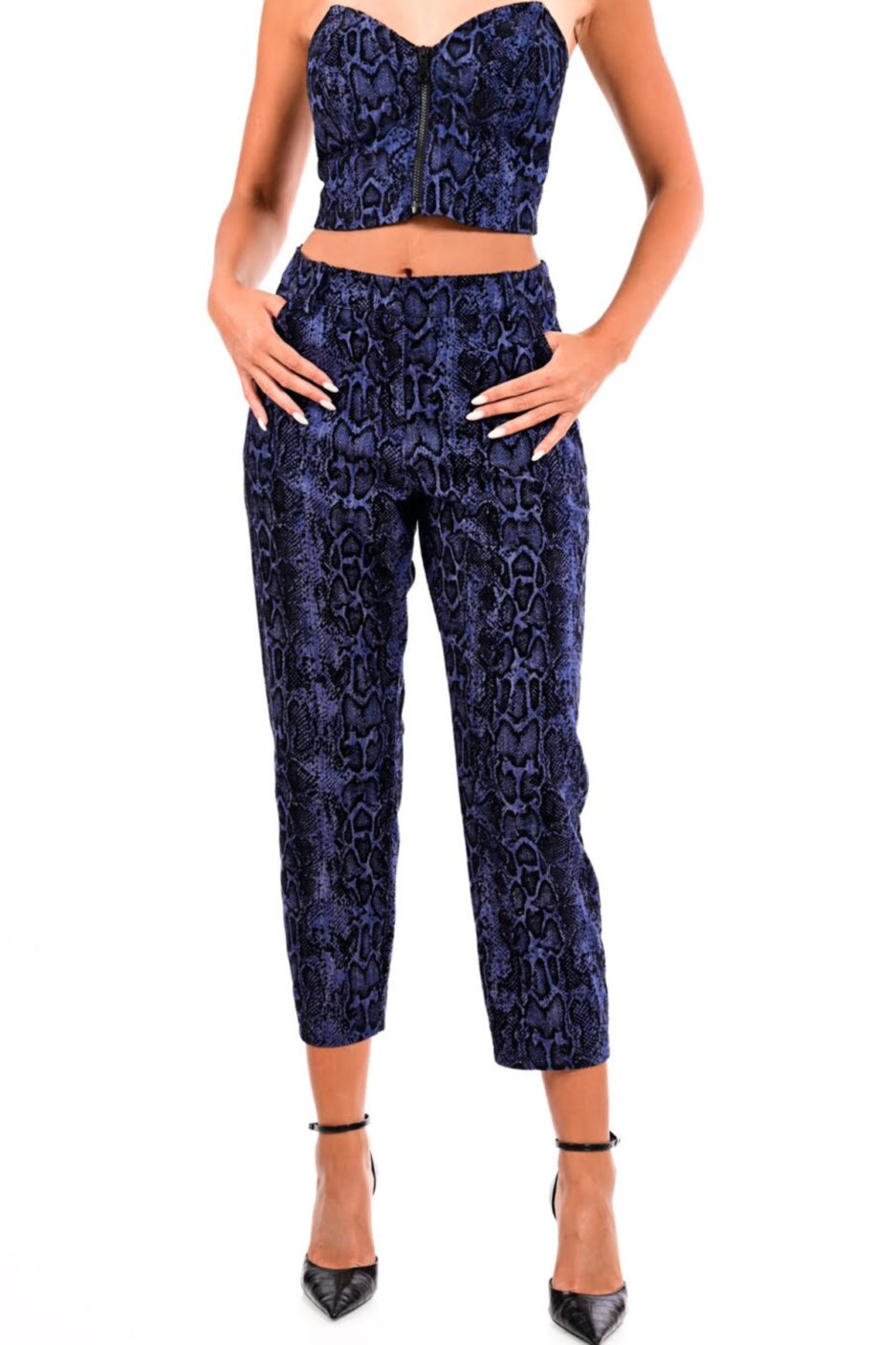 Ψηλόμεσο παντελόνι από ελαφρός ελαστικό βελούδινο μπροκάρ ύφασμα. Το παντελόνι κουμπώνει με κουμπί και φερμουάρ, είναι σε άνετη εφαρμογή και έχει τσέπες στο πλάι και στους γλουτούς. Το προϊόν είναι ελληνικής εταιρείας.