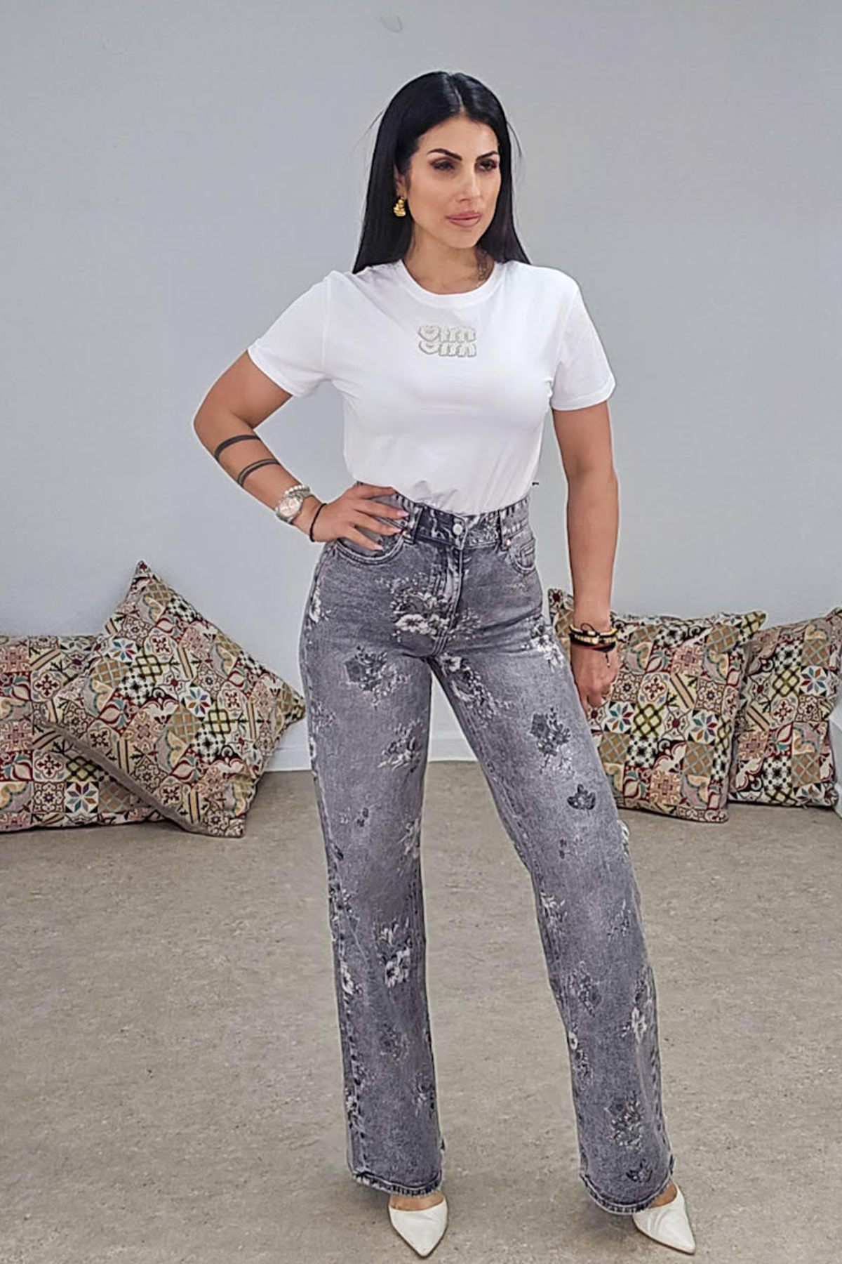 Jean από σταθερό βαμβακερό φλοράλ ύφασμα με μικρή ελαστικότητα. Το παντελόνι είναι σε κανονική εφαρμογή, ίσιο πατζάκι και εφαρμοστό στους γλουτούς. Κουμπώνει με κουμπί και φερμουάρ, έχει τσέπες μπροστά και πίσω.