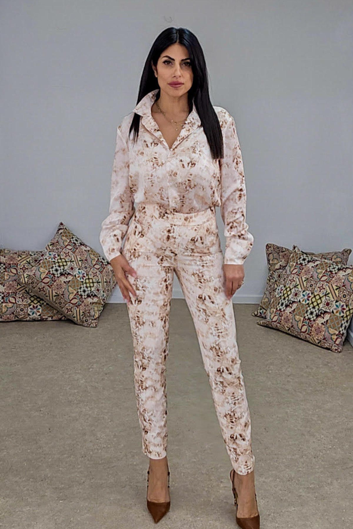 Ψηλόμεσο παντελόνι από σταθερό ύφασμα με μικρή ελαστικότητα. Το παντελόνι είναι εμπριμέ με άνετη εφαρμογή και εφαρμοστό στο σώμα, κουμπώνει με κουμπί και φερμουάρ και έχει τσέπες στο πλάι. Το προιόν είναι ελληνικής εταιρείας.