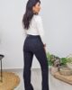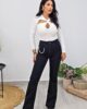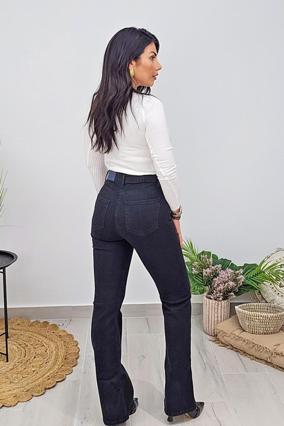 Ψηλόμεσο τζιν παντελόνι από ελαστικό ύφασμα. Το παντελόνι είναι σε άνετη εφαρμογή, κάνει μικρή καμπάνα, έχει τσέπες στο πλάι και στους γλουτούς, κουμπώνει με κουμπί και φερμουάρ και έχει λεπτομέρεια από αλυσίδα με πέρλα που μπορείτε να την βάλετε στην τσέπη. Το προϊόν είναι ελληνικής εταιρείας.