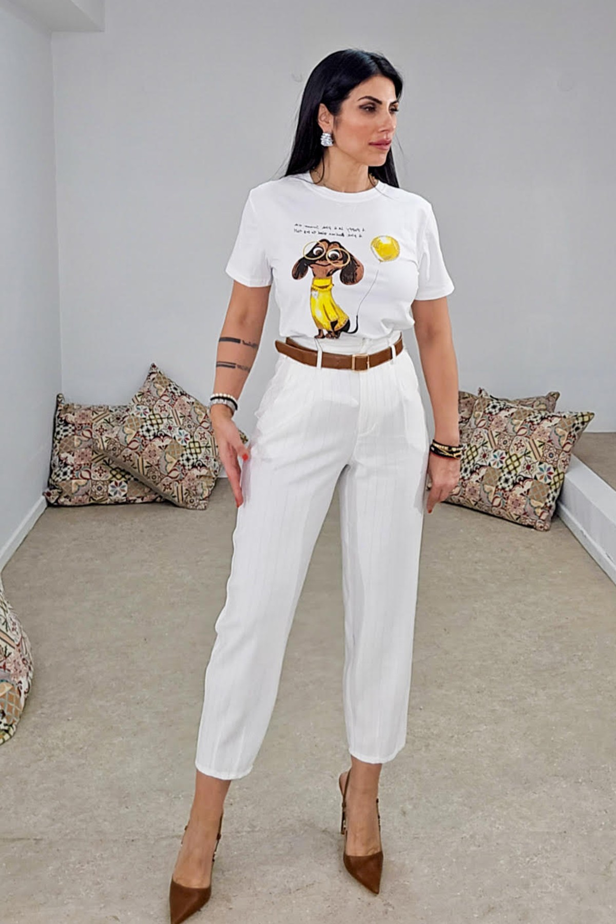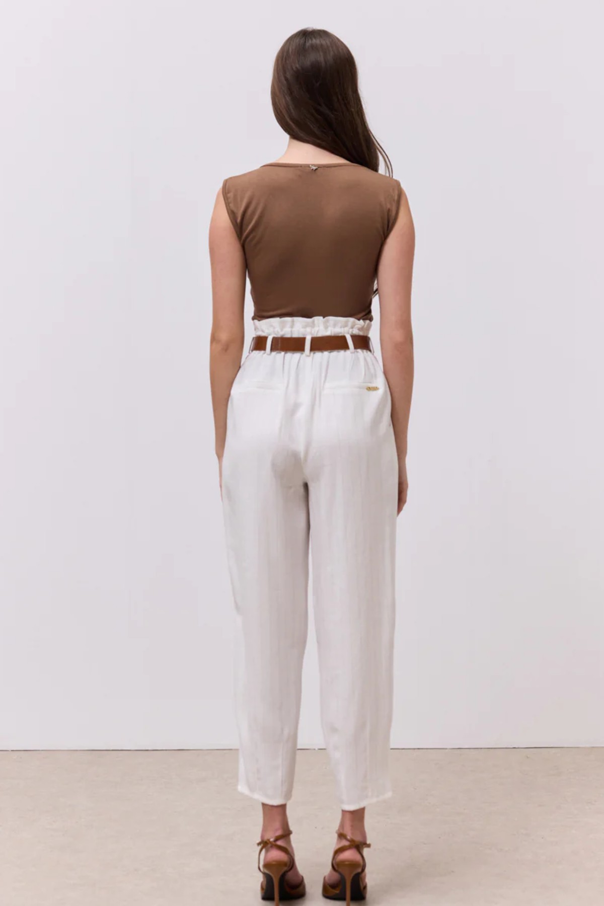 Ψηλόμεσο παντελόνι από σταθερό ριγέ rayon ύφασμα. Το παντελόνι είναι σε άνετη εφαρμογή με λάστιχο πίσω στην μέση, κουμπώνει μπροστά με φερμουάρ, έχει πιέτες στο πλάι και τσέπες , χαλαρό πατζάκι και ζώνη ταμπά που το κάνει πιο σικάτο. Το προιόν είναι ελληνικής εταιρείας.