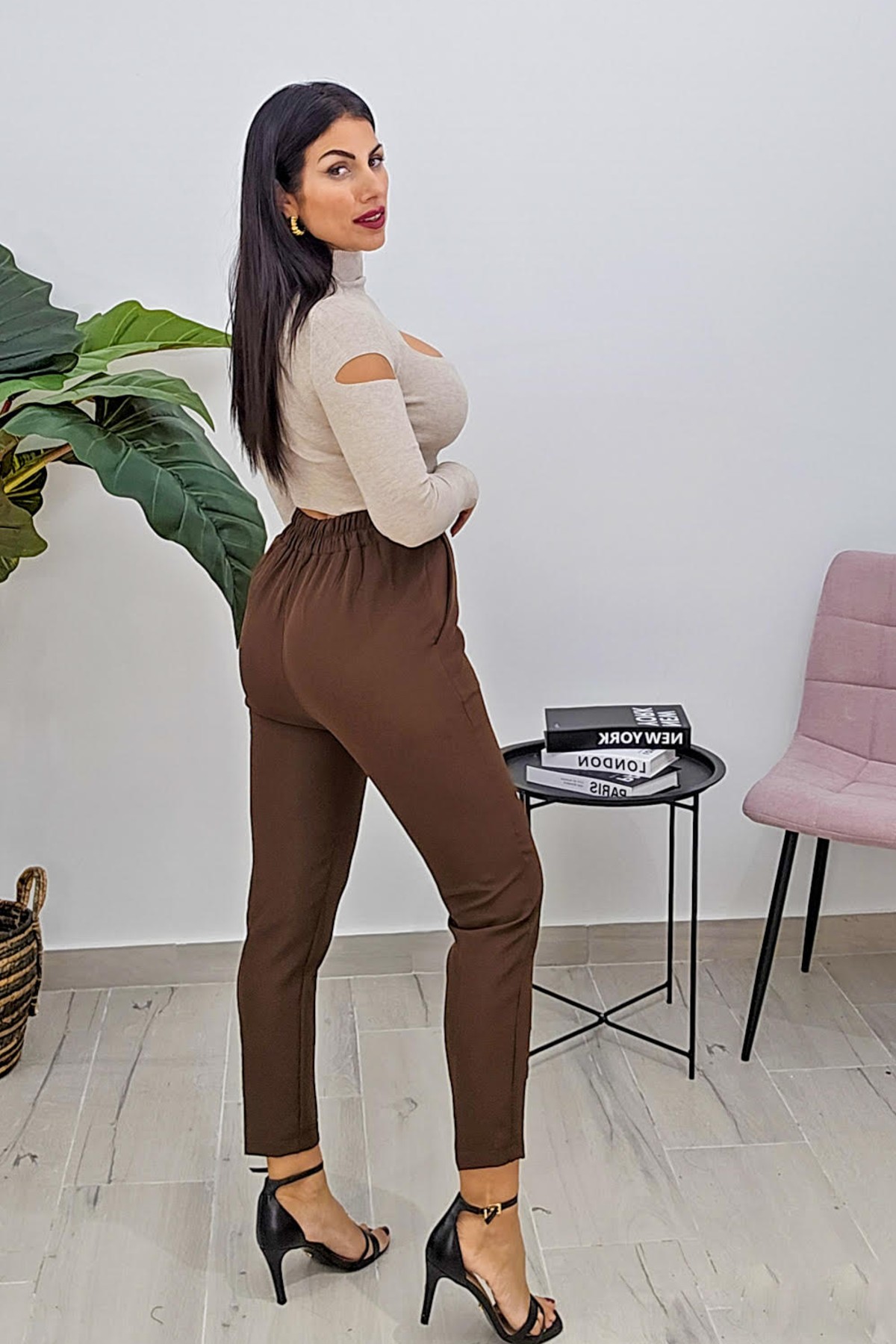 Ψηλόμεσο παντελόνι από σταθερό κρεπ ύφασμα. Το παντελόνι είναι σε άνετη εφαρμογή με τσάκιση στο πατζάκι, λάστιχο πίσω στην μέση και μάκρος πάνω από τον αστράγαλο. Το προϊόν είναι ελληνικής εταιρείας.