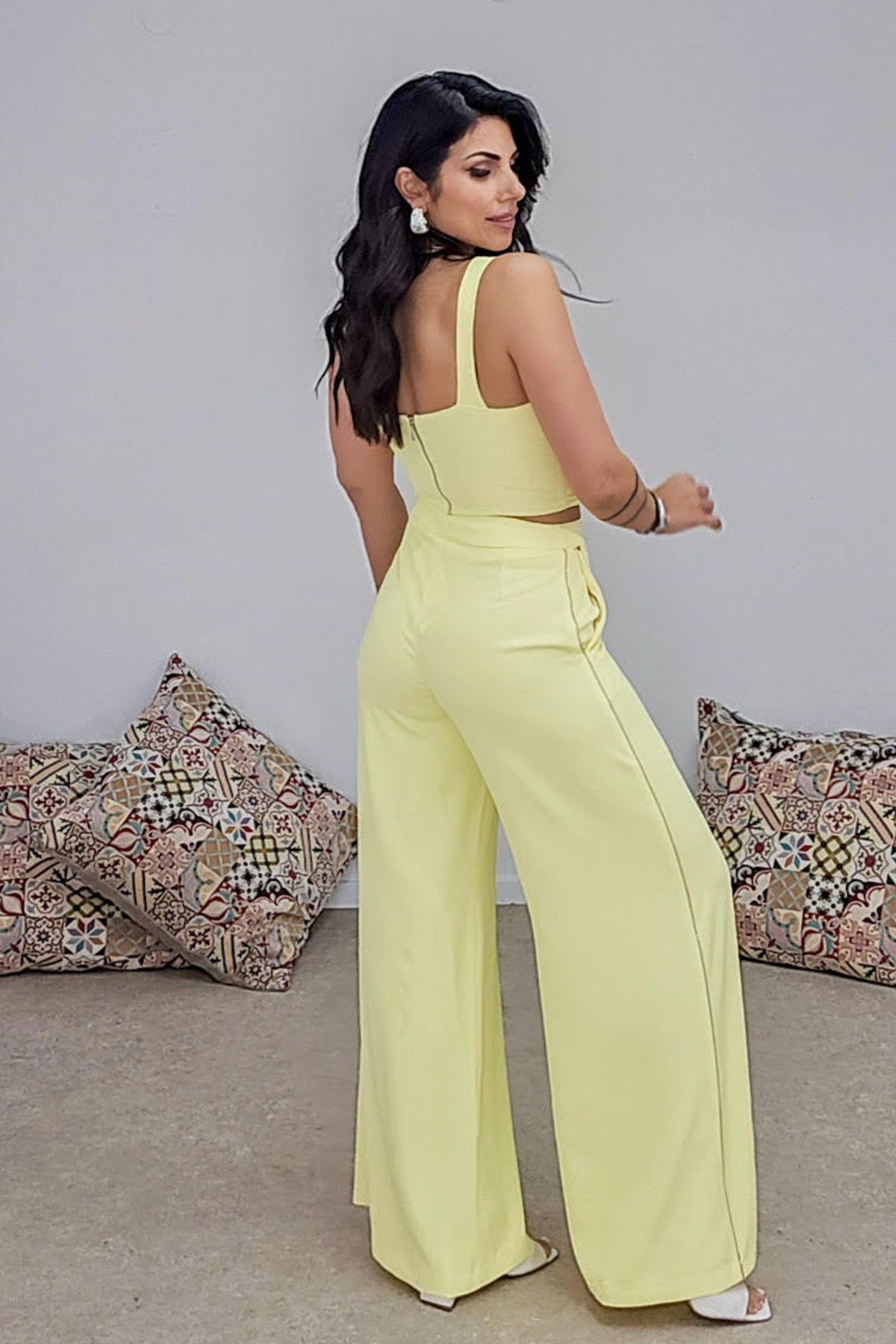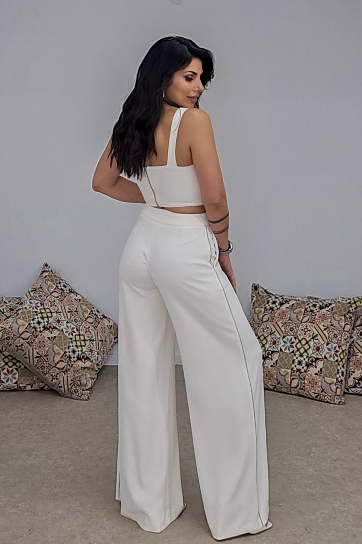 Ψηλόμεση παντελόνα από σταθερό κρεπ ύφασμα με μικρή ελαστικότητα. Το παντελόνι είναι σε άνετη εφαρμογή, κουμπώνει με φερμουάρ και κουμπί ,στο πλάι έχει λεπτομέρεια με τρέσα από strass και στα δυο πατζάκια. Στο πλάι έχει τσέπες. Το ύφασμα έχει κίνηση και είναι αέρινο. Το προιόν είναι ελληνικής εταιρείας.