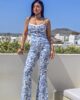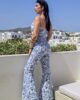 Ψηλόμεσο παντελόνι από ελαστικό τύπου τζιν εμπριμέ ύφασμα. Το παντελόνι είναι σε άνετη εφαρμογή κουμπώνει με χρυσό εντυπωσιακό κουμπί και φερμουάρ, έχει στο πλάι και στους γλουτούς τσέπες και καταλήγει σε καμπάνα. Το προιόν είναι ελληνικής εταιρείας.