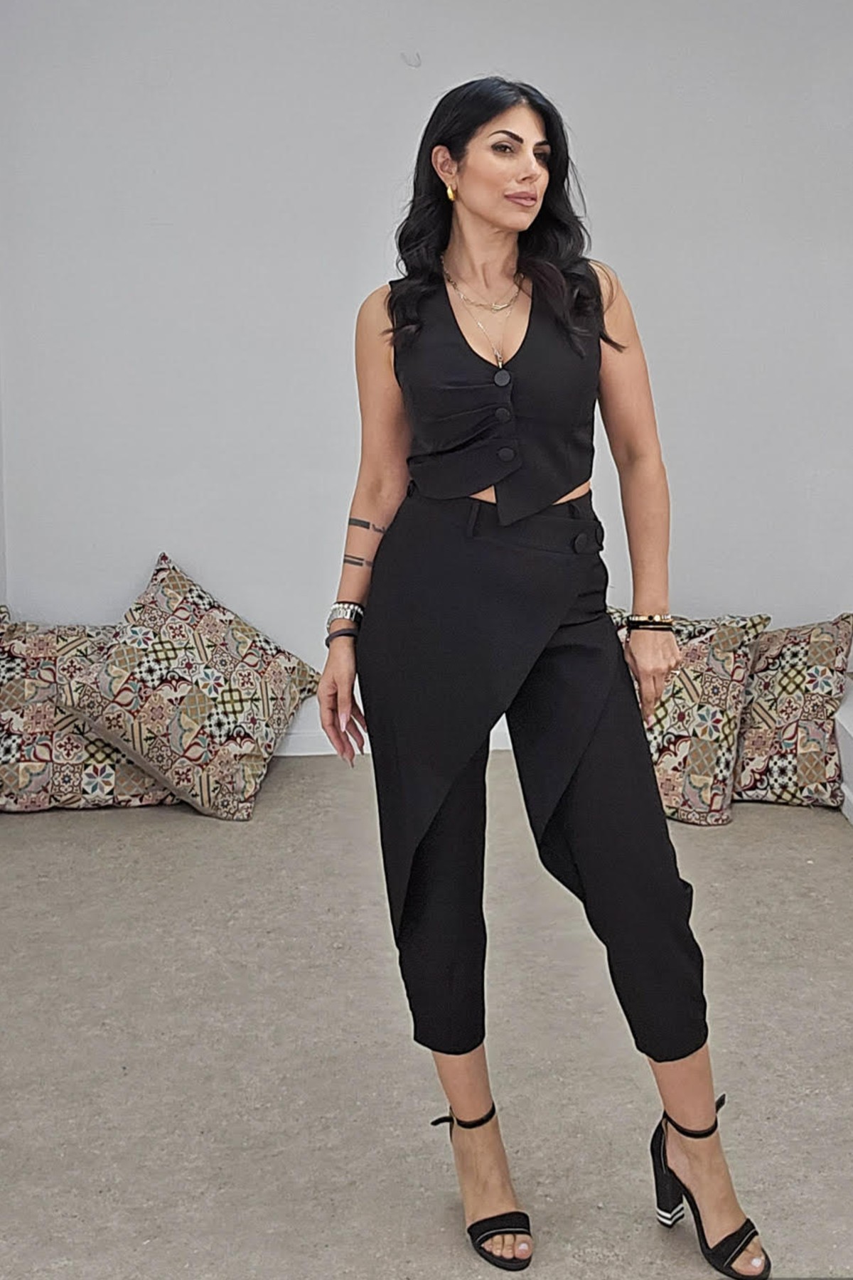 Ψηλόμεσο παντελόνι από σταθερό ανυψωτικό ύφασμα με μικρή ελαστικότητα. Το παντελόνι είναι σε άνετη εφαρμογή με φερμουάρ στο πλάι ,μπροστά πέφτει σαν φάκελος από το ίδιο ύφασμα και καταλήγει σε δύο κουμπιά εντυπωσιακά στο πλάι. Στο ένα πατζάκι έχει σχέδιο με διπλό ύφασμα και το πατρον του είναι σχεδιαστικό. Το προιόν είναι ελληνικής εταιρείας.