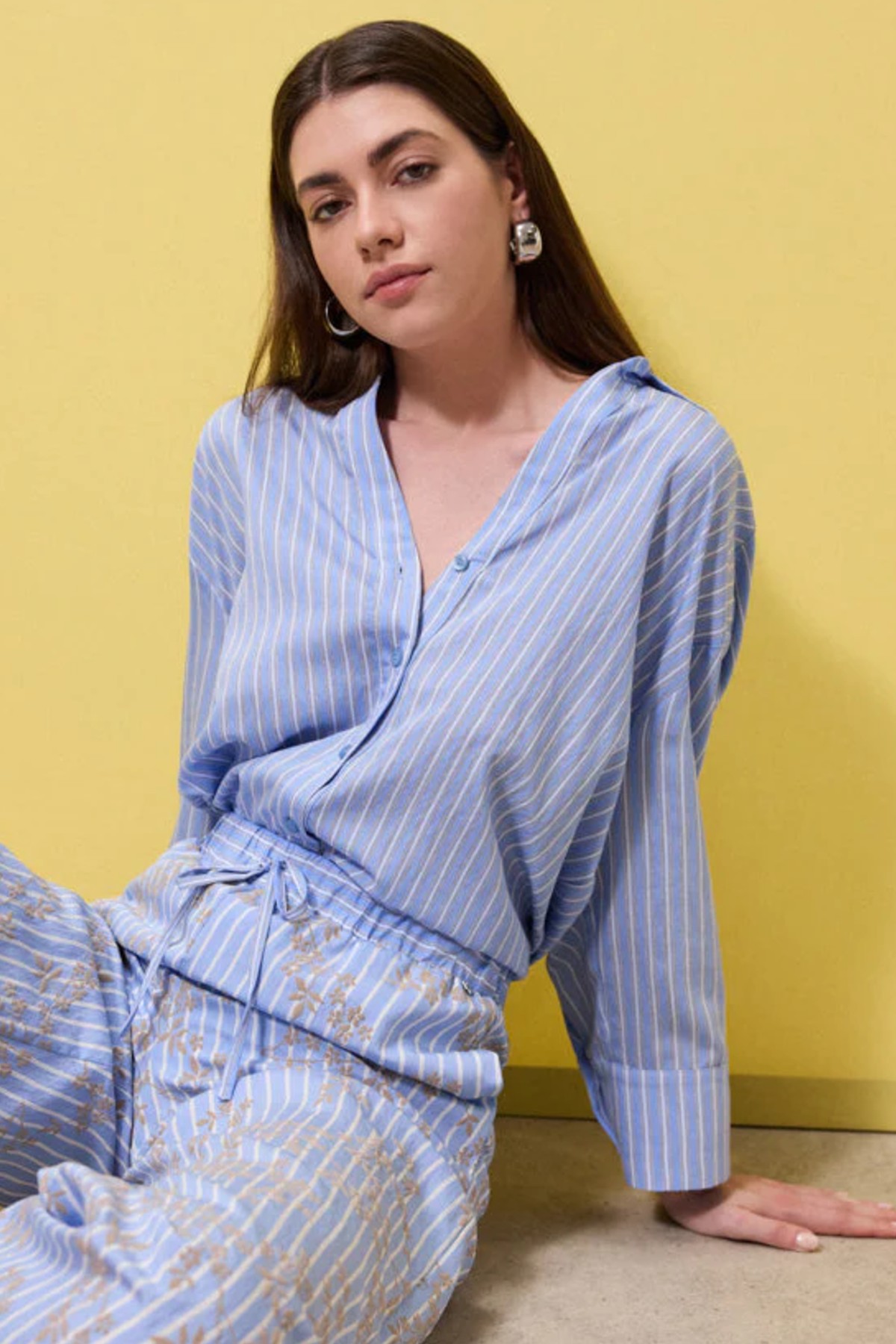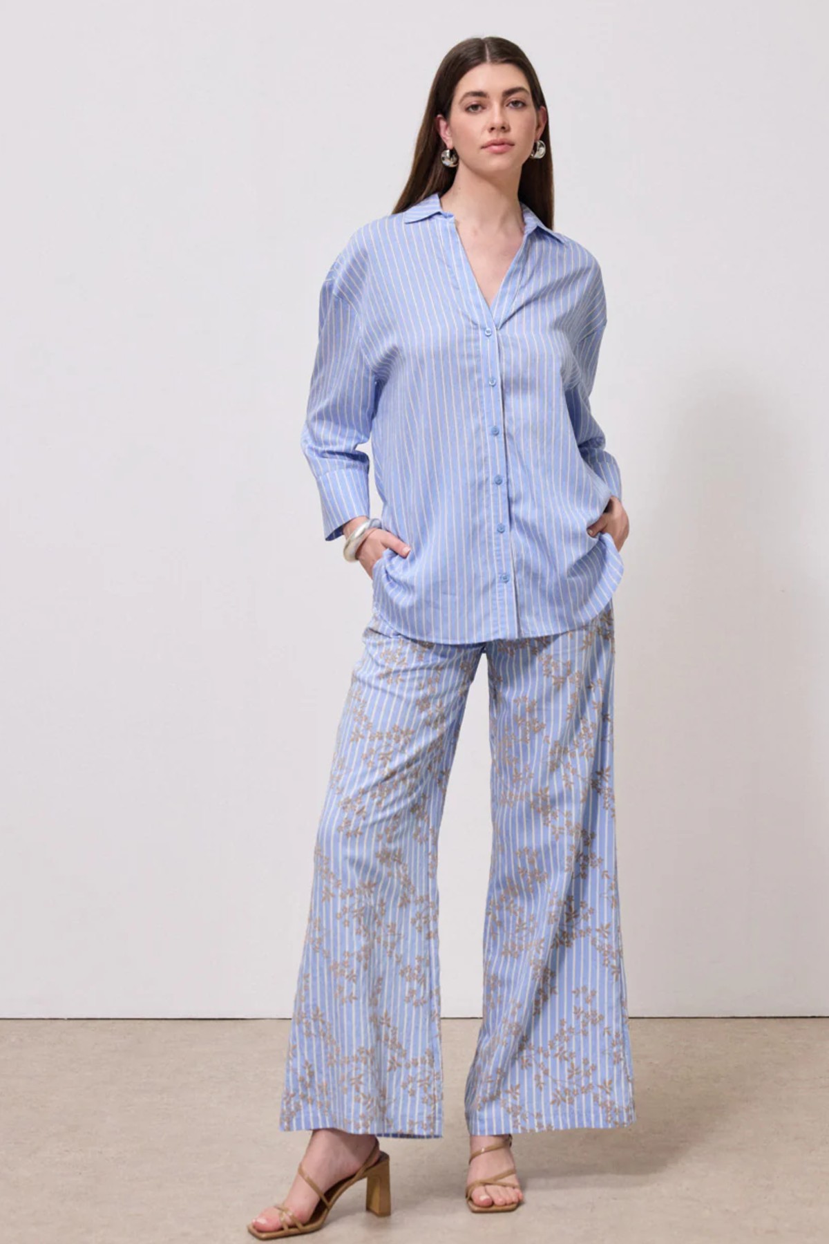 Ψηλόμεση παντελόνα από σταθερή ριγέ βισκόζη. Το παντελόνι έχει άνετη εφαρμογή, τσέπες στο πλάι ,λάστιχο στην μέση με κορδονάκι και σχέδιο με ανάγλυφο τύπωμα σε όλο το πατζάκι. Το προιόν είναι ελληνικής εταιρείας.