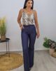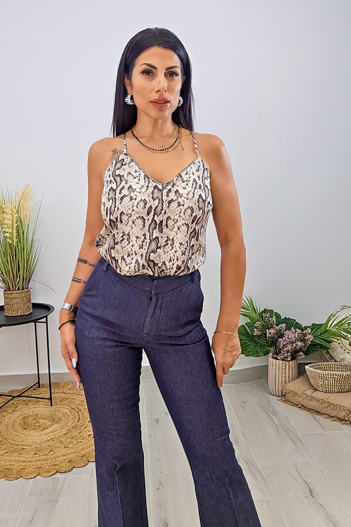 Ψηλόμεσο τζιν παντελόνι από ελαφρός ελαστικό βαμβακερό ύφασμα. Το παντελόνι είναι σε άνετη εφαρμογή, κουμπώνει με κόπιτσα ,κουμπί και φερμουάρ ,έχει διακοσμητικές τσέπες στους γλουτούς και τσέπες στο πλάι. Το παντελόνι κάνει σχέδιο καμπάνα. Το προϊόν είναι ελληνικής εταιρείας.