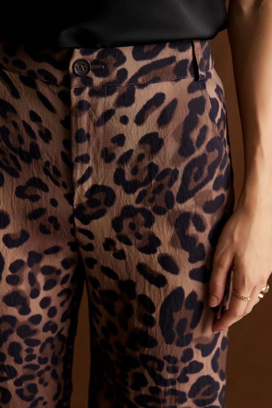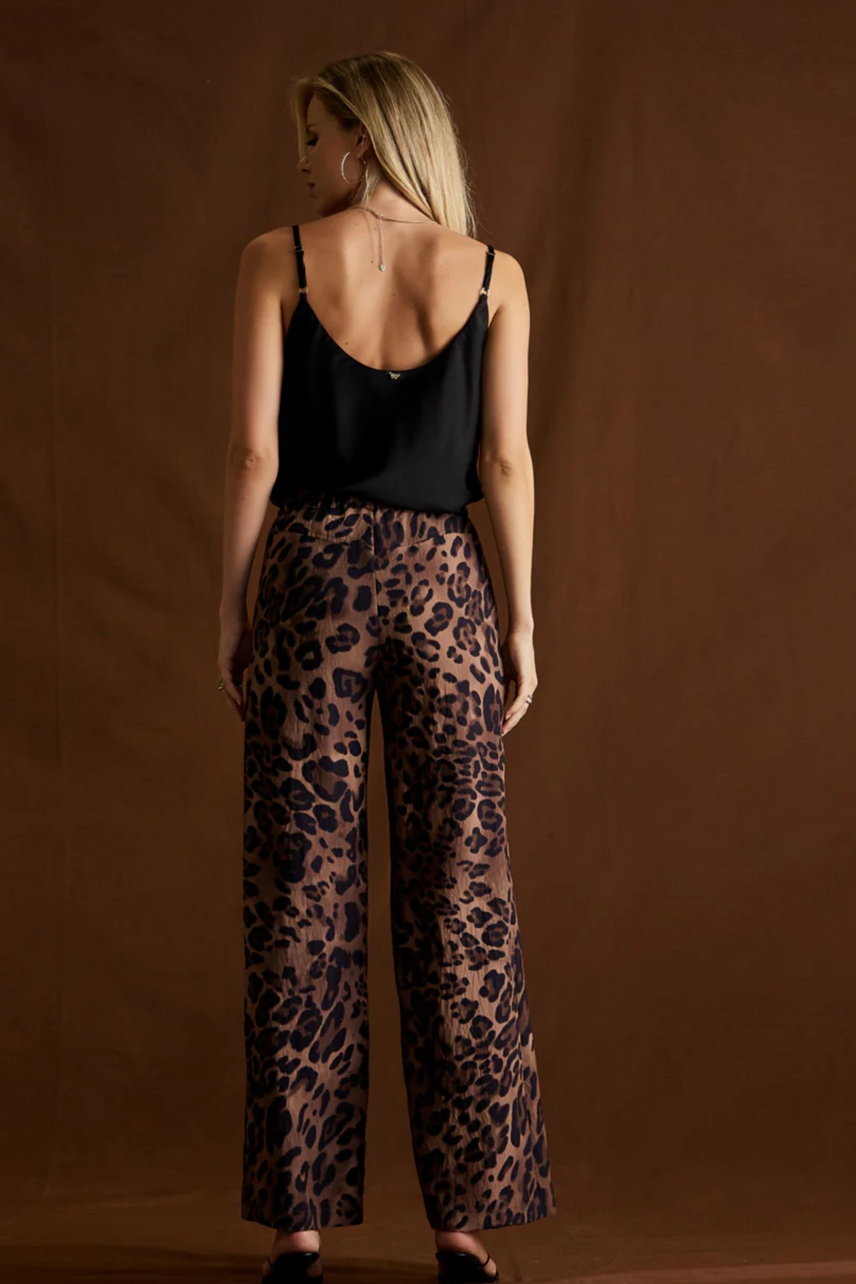 Ψηλόμεση παντελόνα από σταθερή βισκόζη με animl print. Το παντελόνι είναι σε ίσια άνετη εφαρμογή, κουμπώνει με κουμπί και φερμουάρ, έχει τσέπες στο πλάι, λάστιχο στην μέση και ίσιο φαρδύ πατζάκι. Το προϊόν είναι ελληνικής εταιρείας.