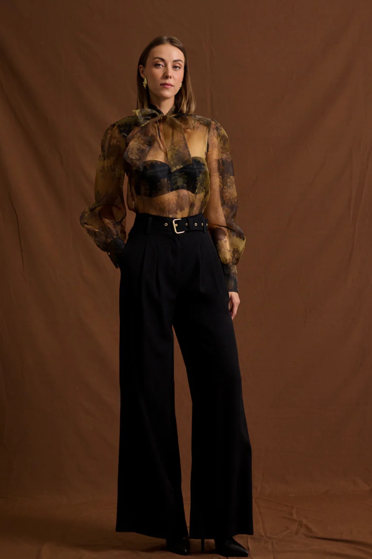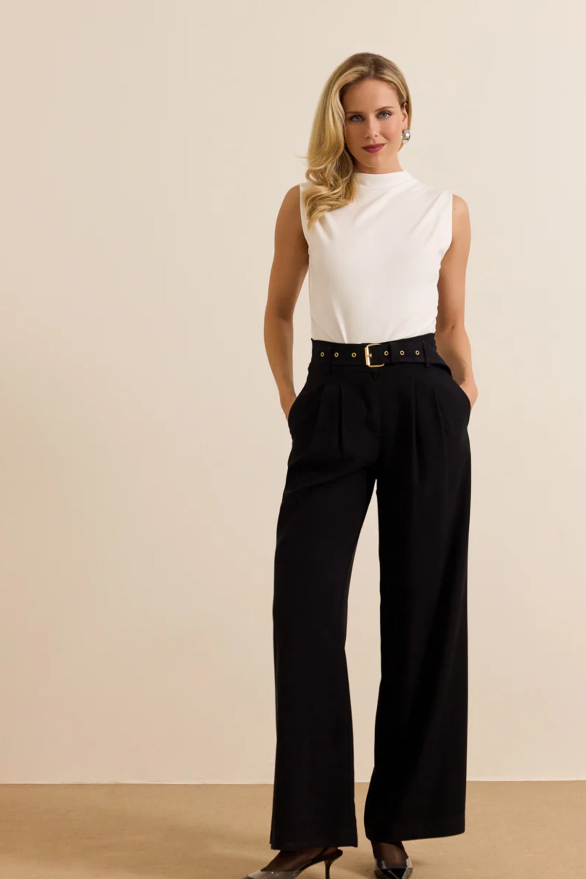 Ψηλόμεσο παντελόνι από σταθερό ύφασμα με βισκόζη. Το παντελόνι είναι σε άνετη εφαρμογή με πιέτες μπροστά, έχει ζώνη με χρυσή αγκράφα, τσέπες στο πλάι και διακοσμητικές τσέπες στους γλουτούς .Κουμπώνει με κουμπί και φερμουάρ. Το προϊόν είναι ελληνικής εταιρείας.