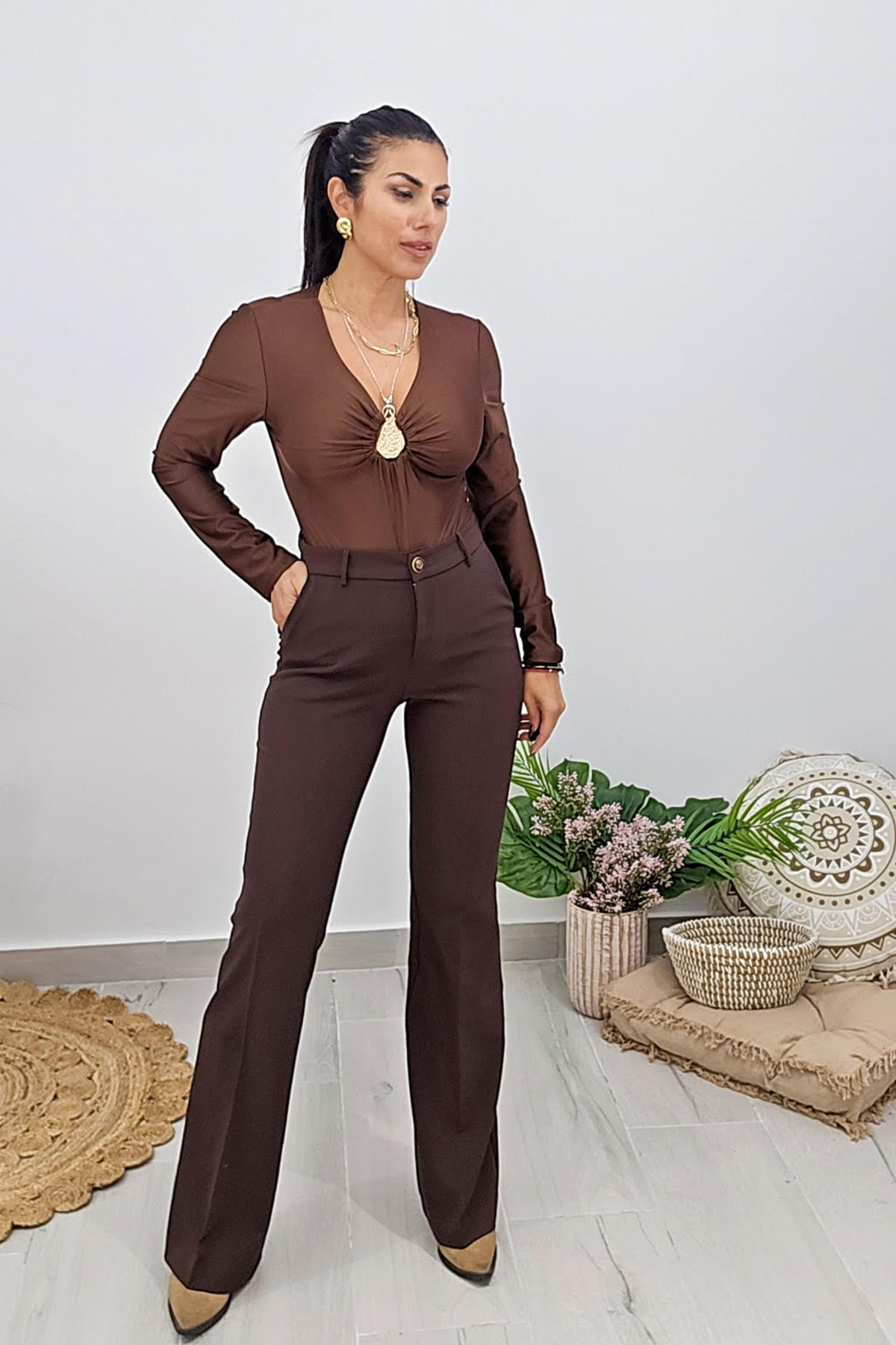 Ψηλόμεσο παντελόνι πό ανυψωτικό σταθερό ύφασμα με μικρή ελαστικότητα. Το παντελόνι είναι σε άνετη εφαρμογή, κουμπώνει με κουμπί και φερμουάρ, έχει τσέπες στο πλάι και φιλέτο τσέπες στους γλουτούς. Το παντελόνι είναι στενό πάνω και καταλήγει σε ελαφριά καμπάνα στο τελείωμα. Το προϊόν είναι ελληνικής εταιρείας.