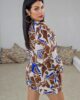 Ολόσωμο φορμάκι από σταθερή εμπριμέ μουσελίνα. Το φορμάκι είναι σε άνετη εφαρμογή με λάστιχο στην μέση, κουμπώνει μπροστά με κουμπιά και κορδόνι στο μπούστο. Έχει μακρύ μανίκι που δένει στο τελείωμα. Το προιόν είναι ελληνικής εταιρείας.