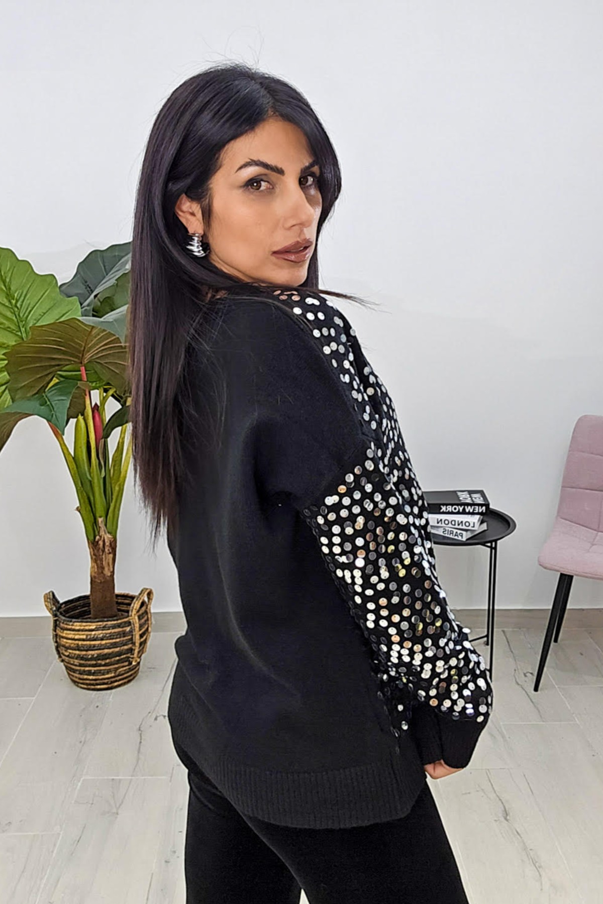 Ζακέτα από ελαστική πλεκτή βισκόζη. Η ζακέτα είναι σε άνετη εφαρμογή με μακρύ μανίκι, κουμπώνει με κουμπιά και έχει εντυπωσιακές ασημί παγιέτες στο μπροστά μέρος.
