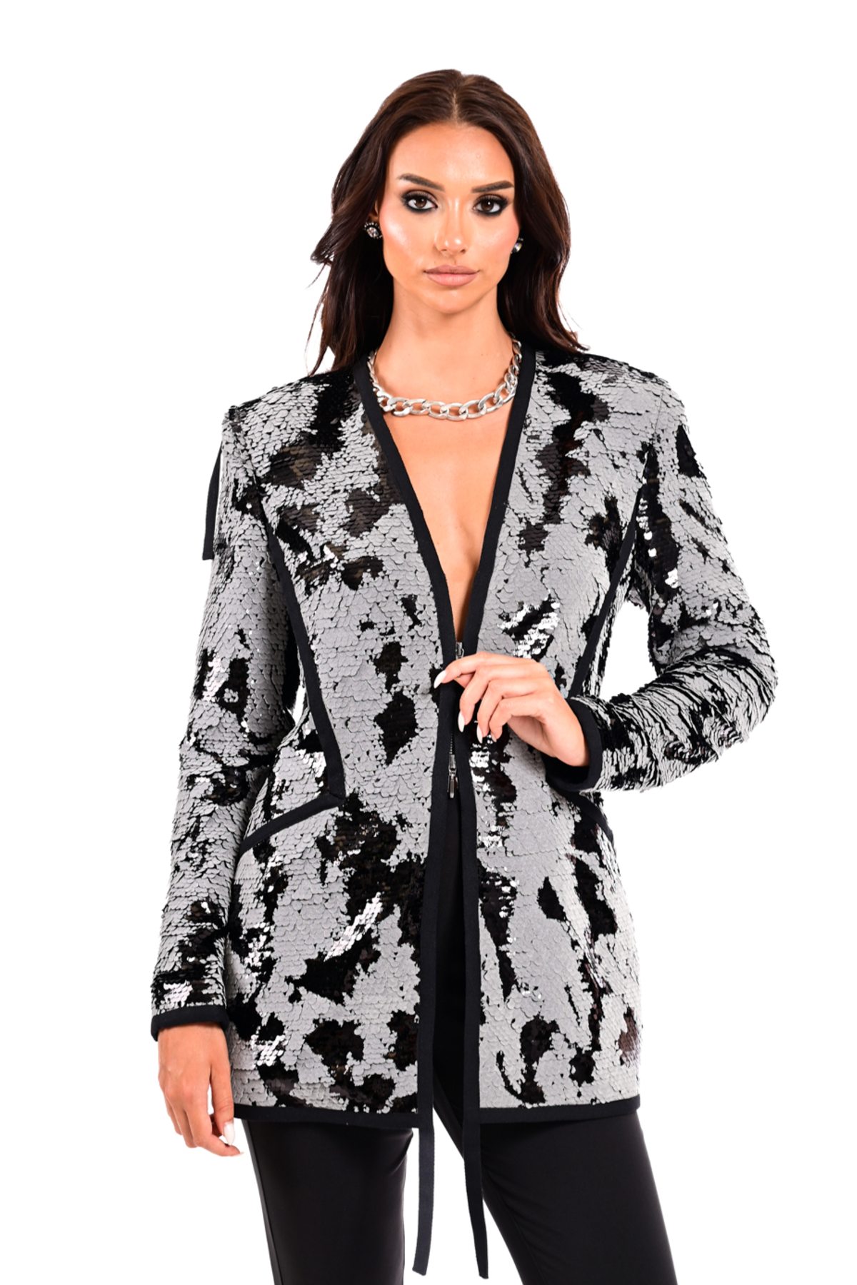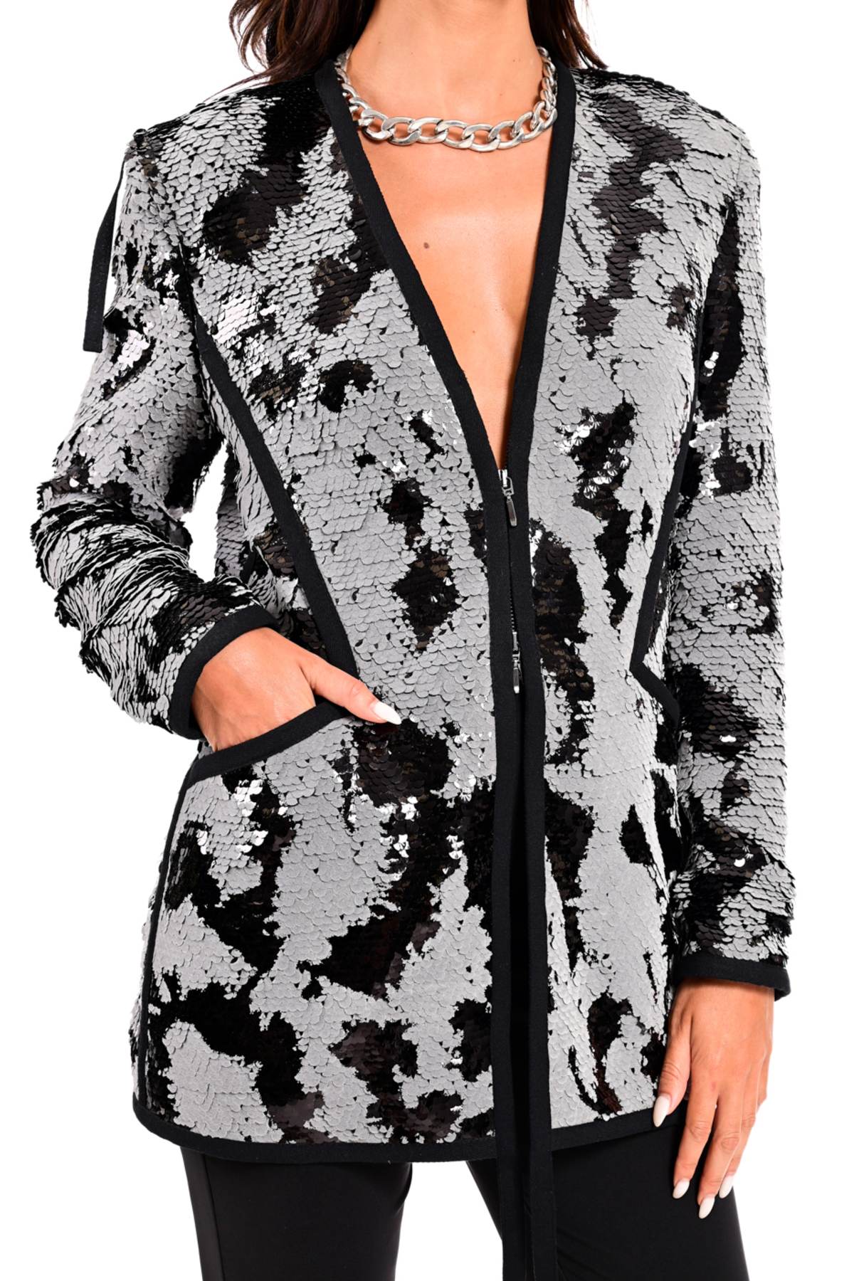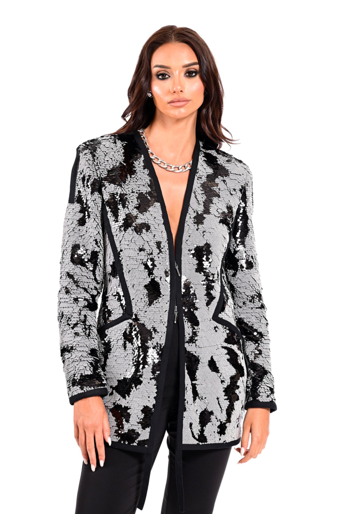 Μακρύ σακάκι από σταθερή παγιέτα. Το σακάκι είναι σε άνετη ίσια γραμμή, κουμπώνει με φερμουάρ και έχει βάτες στους ώμους. Κάνει δίχρωμη εντυπωσιακή παγιέτα και έχει μαύρα τελειώματα και τσέπες στο πλάι. Το προϊόν είναι ελληνικής εταιρείας.