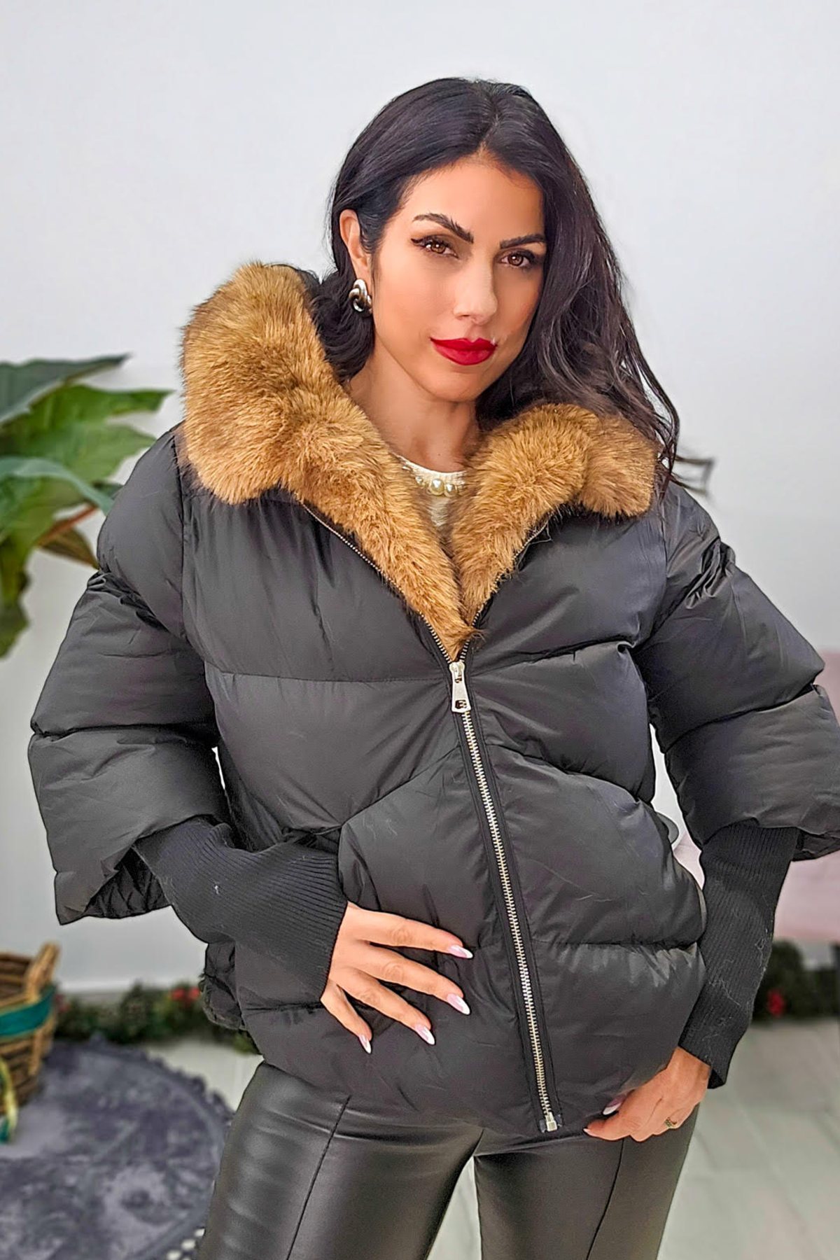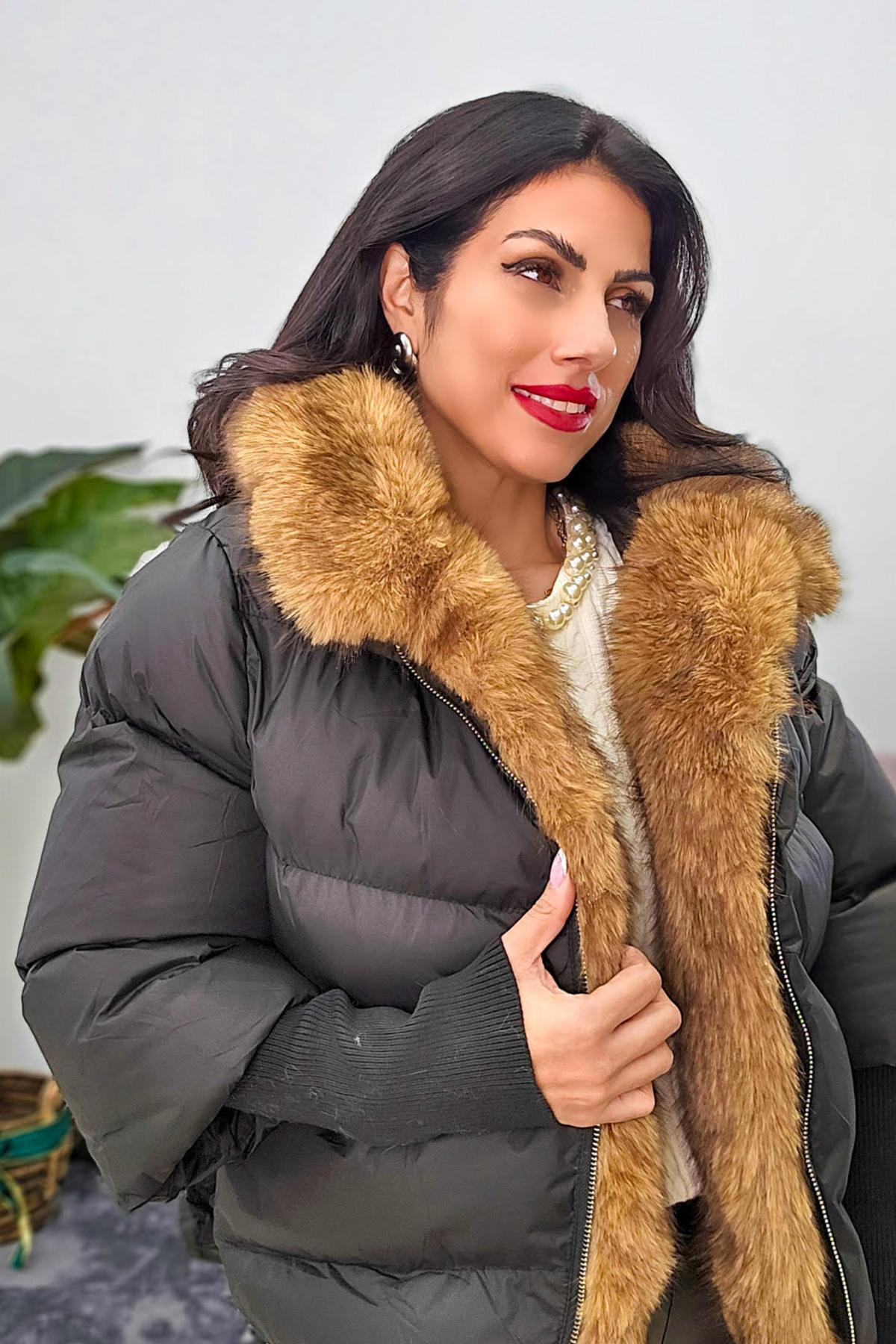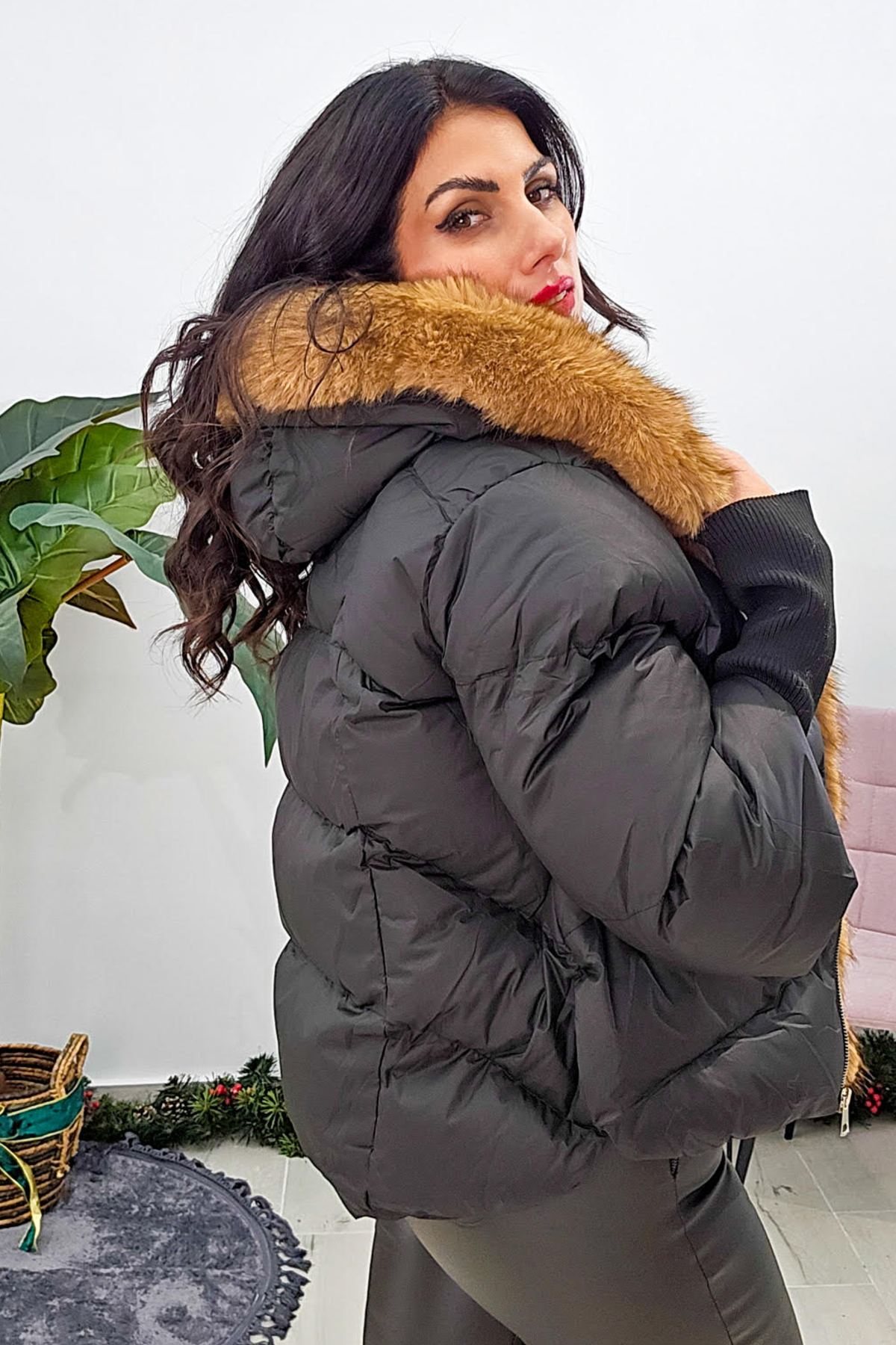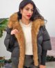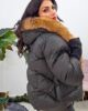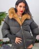 Μπουφάν από σταθερό βαμβακερό ύφασμα με ισοθερμική επένδυση. Το μπουφάν είναι oversized με τσέπες που κλείνουν με φερμουάρ στο πλάι, κουμπώνει μπροστά με φερμουάρ, έχει κουκούλα και εσωτερικά έχει αποσπώμενη γούνα.