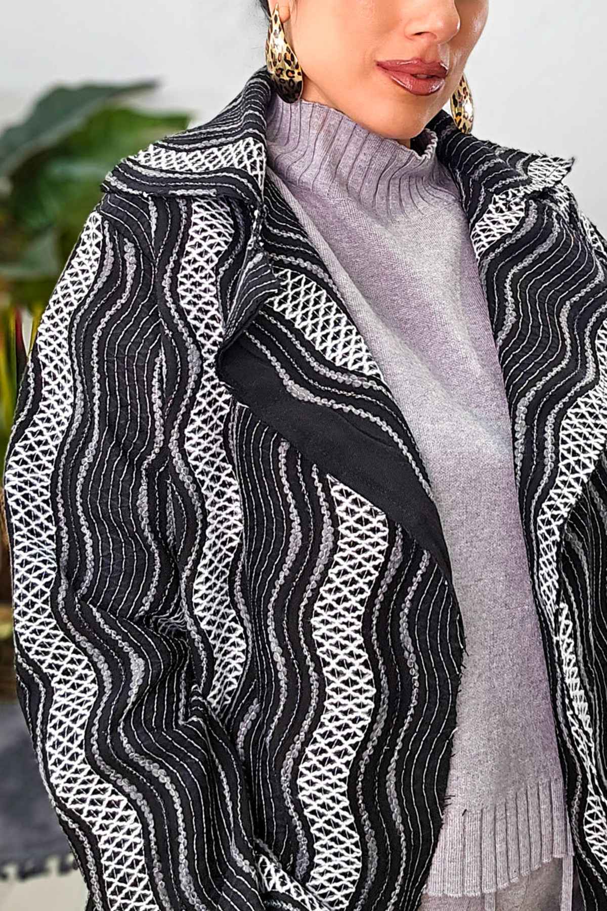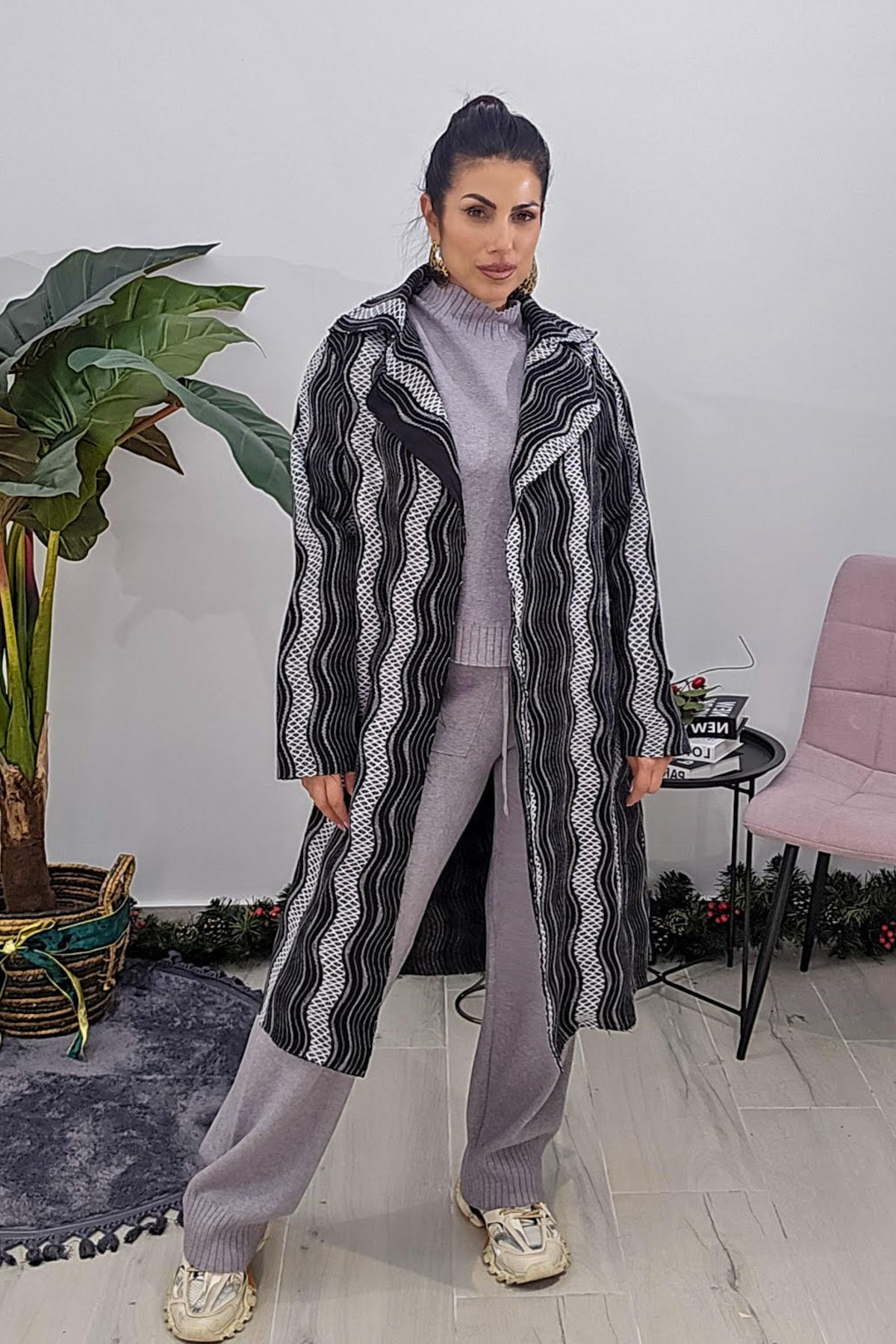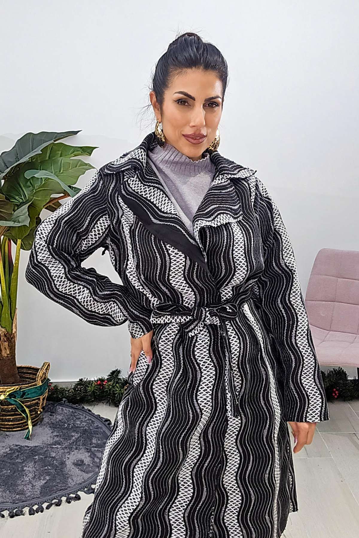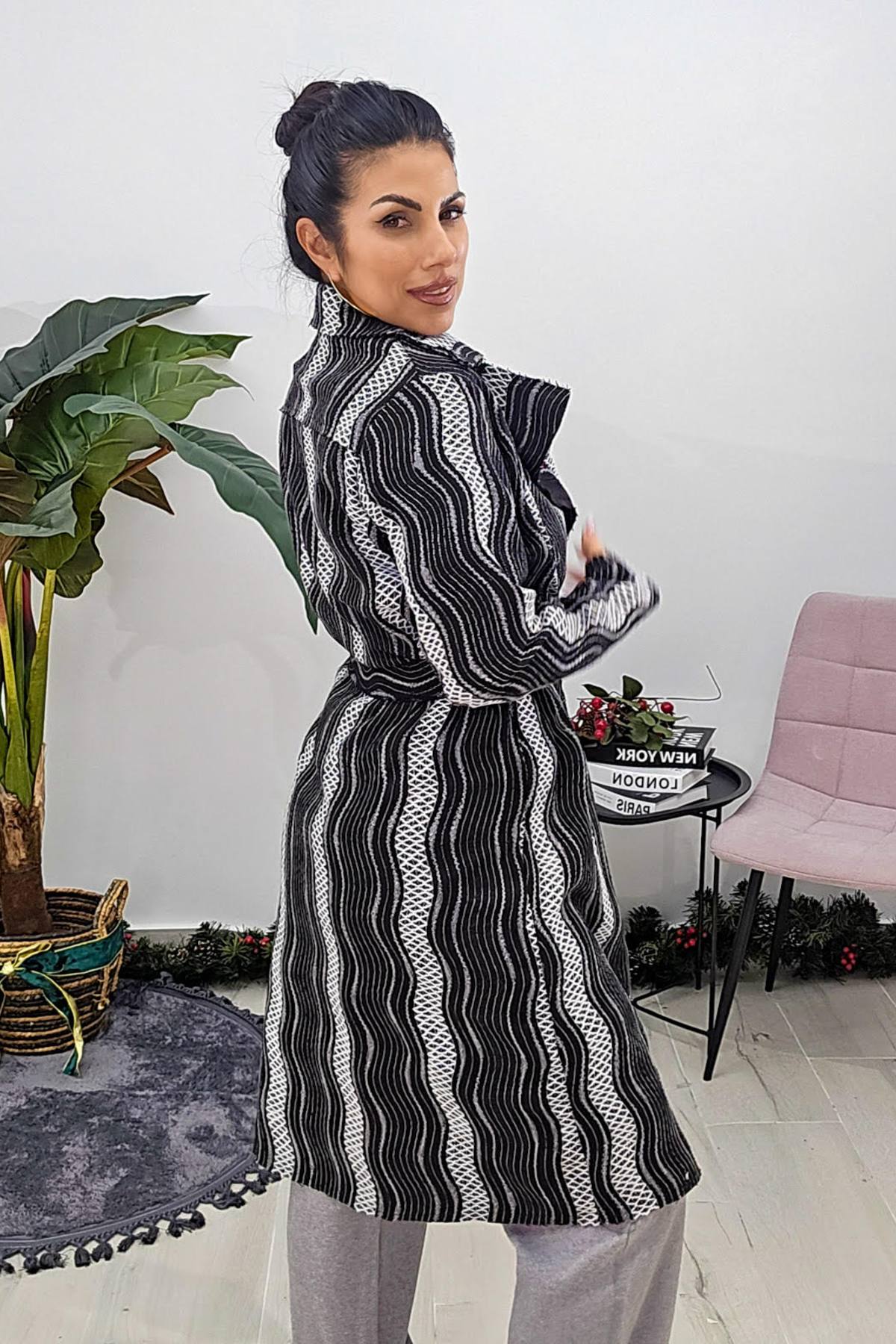 Παλτοζακέτα από σταθερό ανάγλυφο ύφασμα. Η ζακέτα είναι σε άνετη εφαρμογή με μακρύ μανίκι και γιακά ανάλαφρο. Στην μέση έχει ζώνη από το ίδιο ύφασμα. Το προιόν είναι ελληνικής εταιρείας.