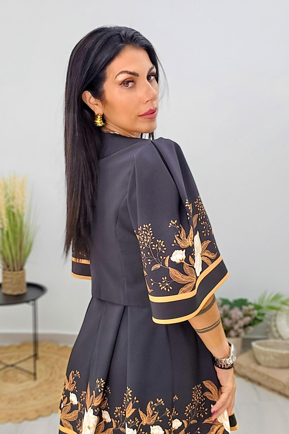 Bolero από σταθερό ύφασμα. Το σακάκι είναι σε άνετη εφαρμογή , κουμπώνει μπροστά με εντυπωσιακό κουμπί στον λαιμό, έχει ρομαντικό μανίκι με τύπωμα και είναι σε ίσια γραμμή. Το προϊόν είναι ελληνικής εταιρείας.