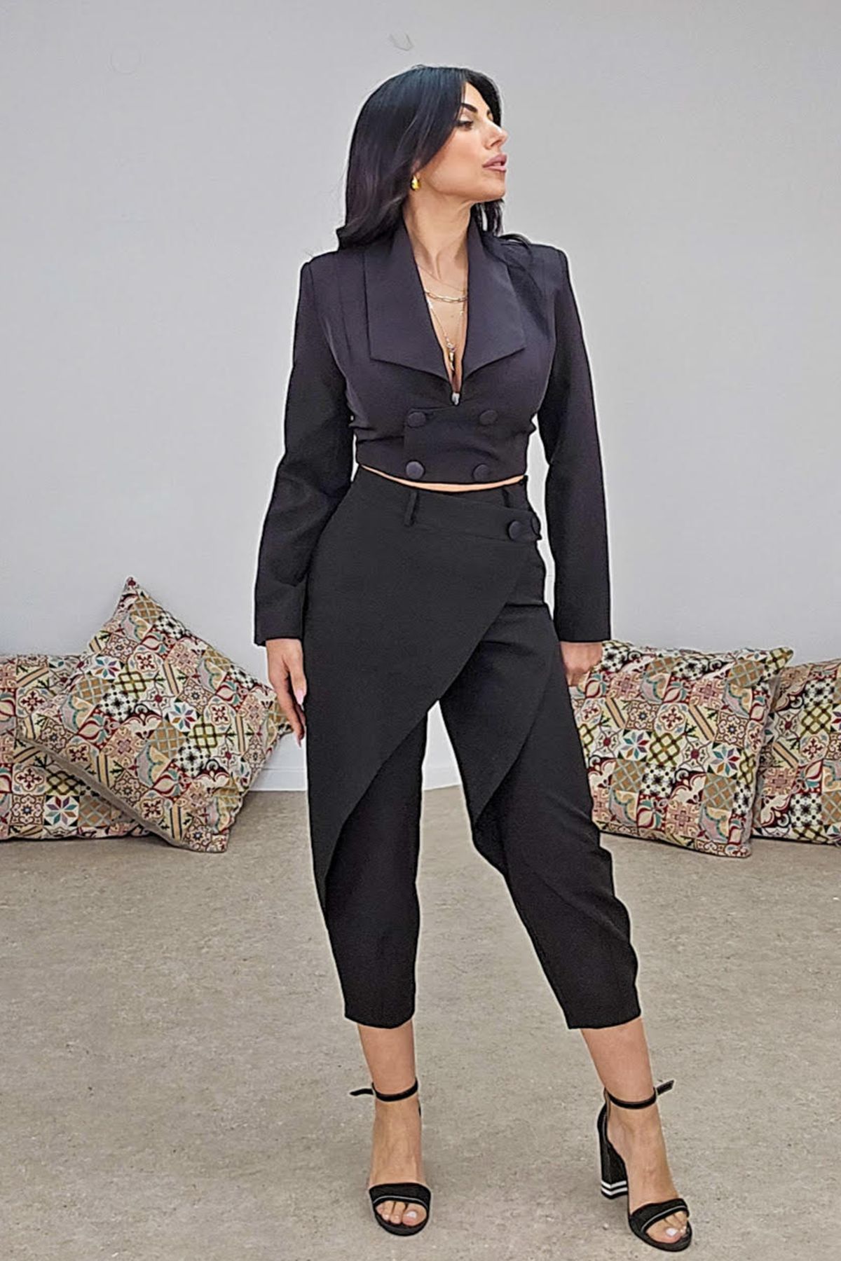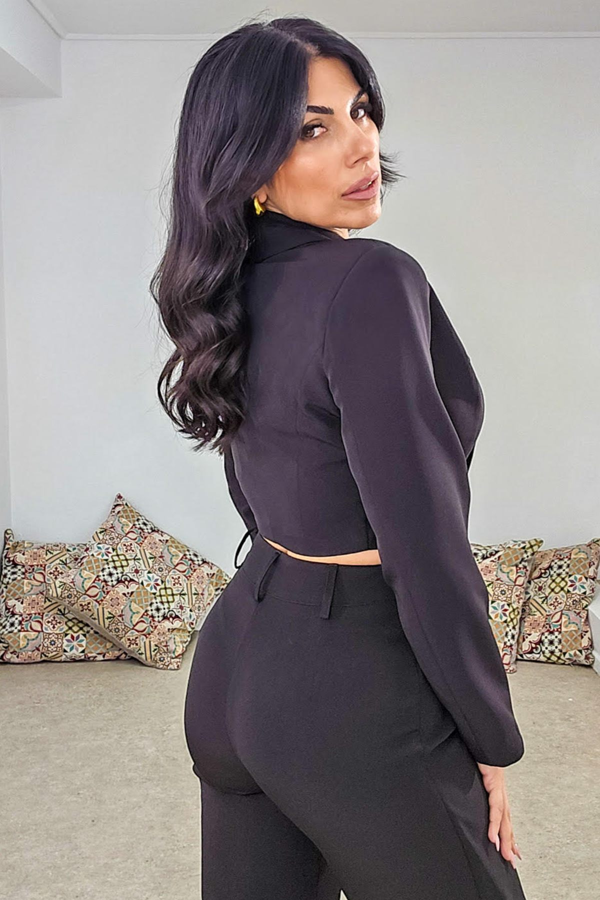 Σακάκι cropped από σταθερό ύφασμα. Το σακάκι είναι σε άνετη εφαρμογή ,σταυροκουμπωτό με μεγάλα εντυπωσιακά κουμπιά ,πέτο και βάτες. Το σακάκι εσωτερικά έχει φόδρα. Το προιόν είναι ελληνικής εταιρείας.