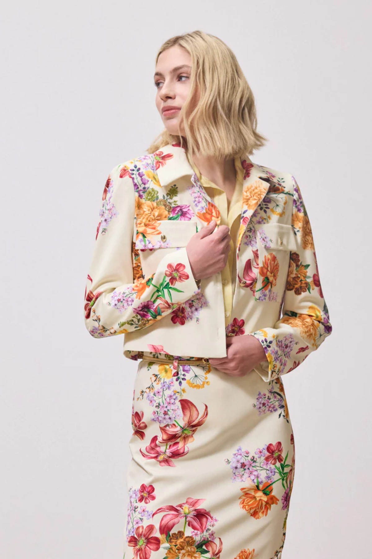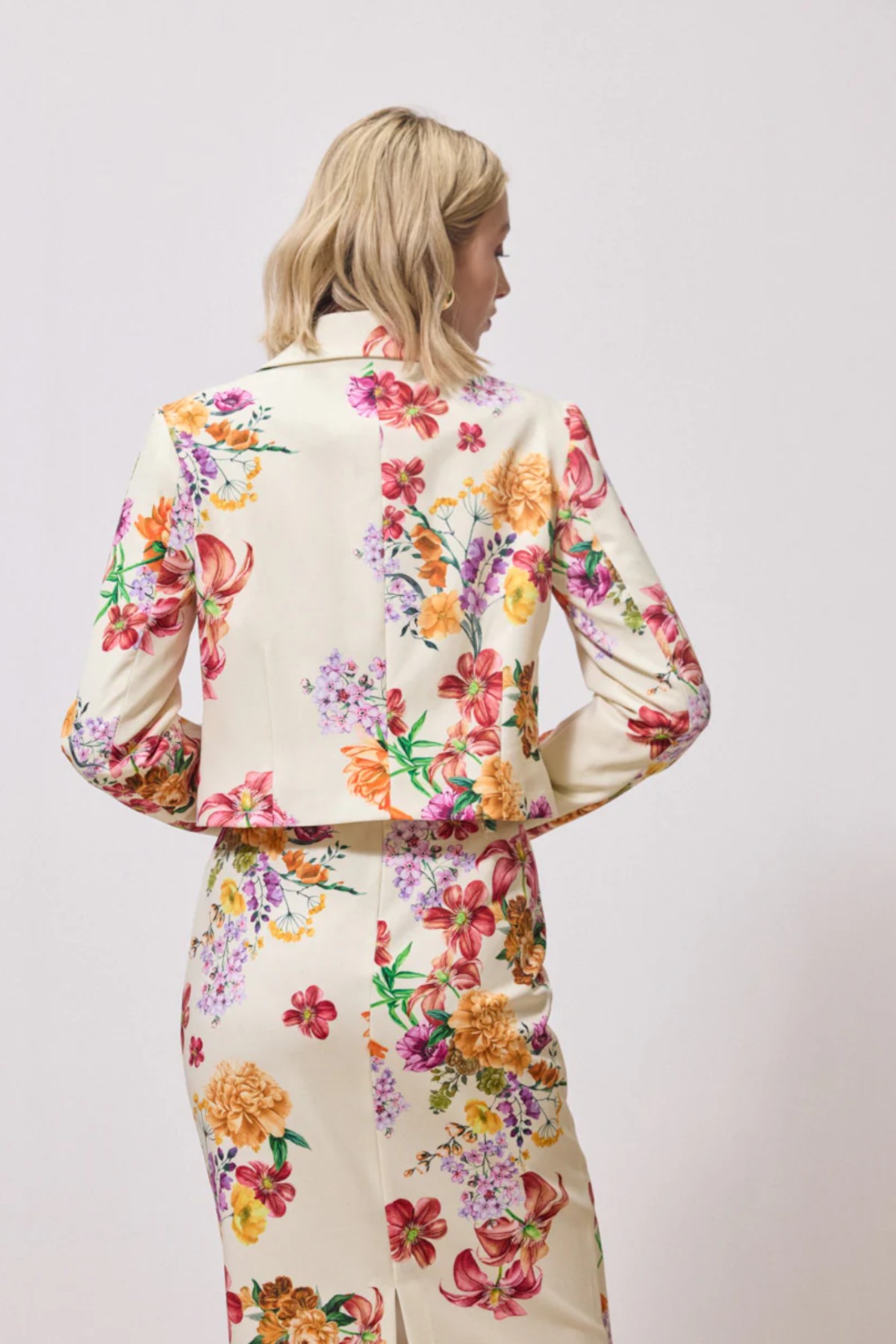 Σακάκι από σταθερό φλοράλ ύφασμα. Το σακάκι είναι cropped σε άνετη εφαρμογή και ίσια γραμμή, έχει λεπτομέρειες με χρυσά εντυπωσιακά κουμπιά , τσέπες στο μπούστο, γιακά και μακρύ μανίκι. Το προιόν είναι ελληνικής εταιρείας.