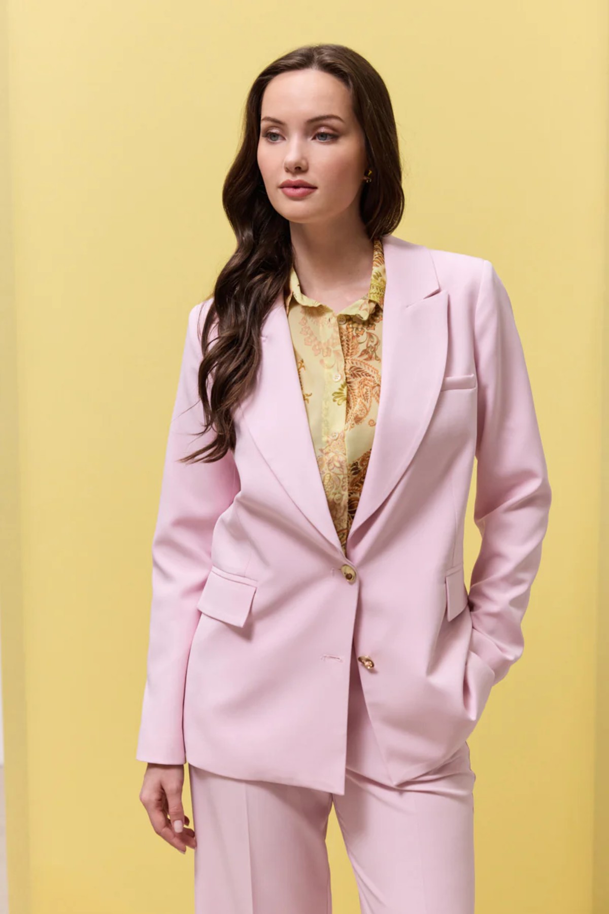 Σακάκι από σταθερό ύφασμα με μικρή ελαστικότητα. Το σακάκι είναι σε άνετη εφαρμογή ελαφρώς μεσάτο, κλείνει μπροστά με χρυσά εντυπωσιακά κουμπιά, έχει πέτο και φόδρα εσωτερικά και τσέπες με καπάκι μπροστά. Το προιόν είναι ελληνικής εταιρείας.