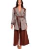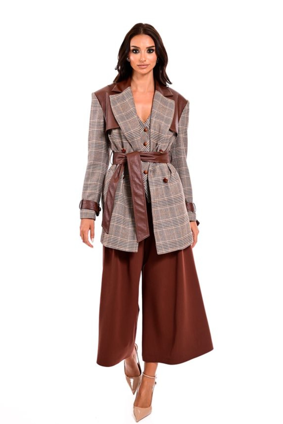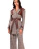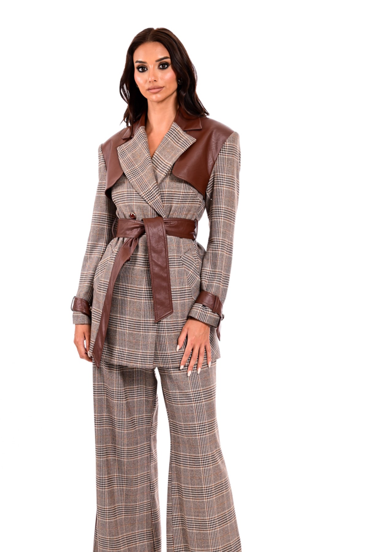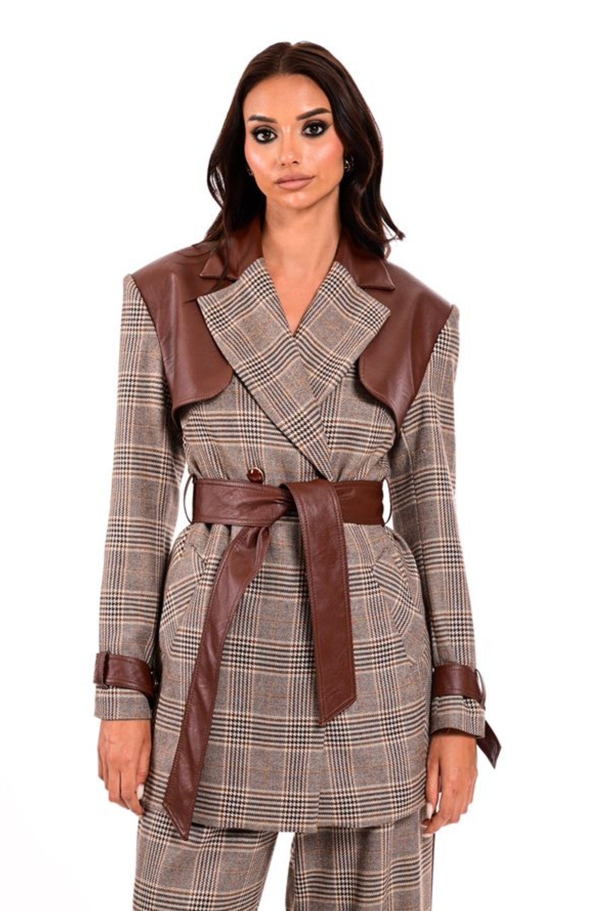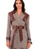 Σακάκι μακρύ από σταθερό ύφασμα με καρό print. Το σακάκι είναι σε άνετη εφαρμογή με λεπτομέρειες σε καφέ δερματίνη, ζώνη στην μέση που το κάνει πιο θηλυκό και εντυπωσιακά κουμπιά. Το προϊόν είναι ελληνικής εταιρείας.