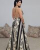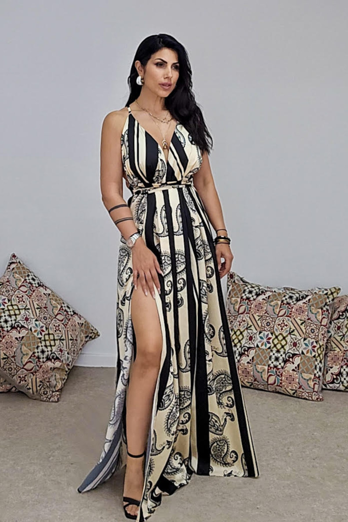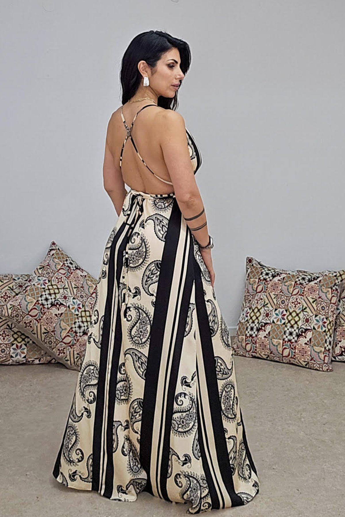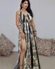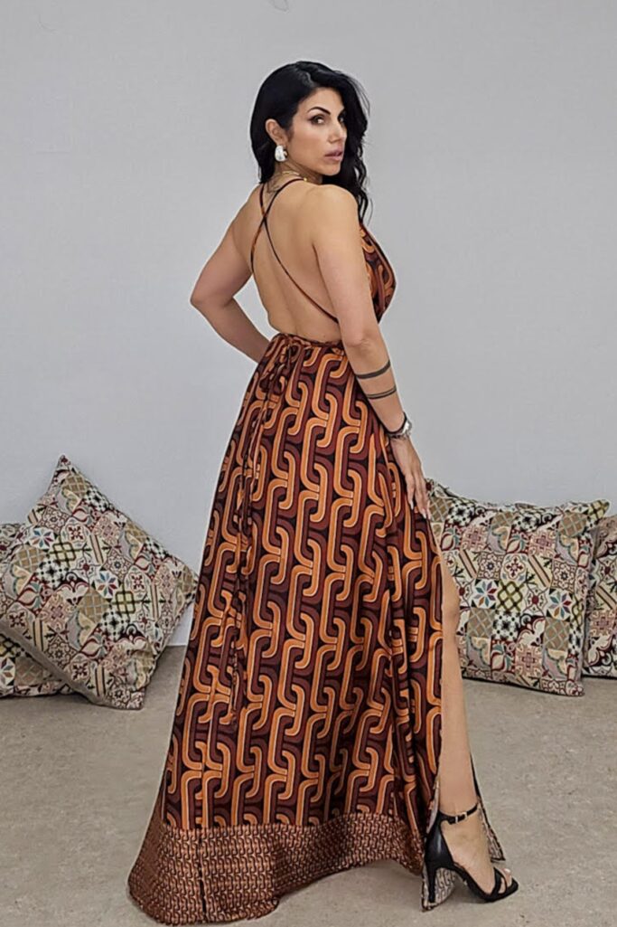 Maxi φόρεμα από σταθερό εμπριμέ σατέν ύφασμα. Το φόρεμα είναι σε άνετη εφαρμογή με λάστιχο στην μέση , δένει με κορδόνι που περνάει από την πλάτη χιαστή και ρυθμίζεται πάνω στο σώμα. Στο πόδι έχει άνοιγμα και πιέτες μπροστά με πλούσιο ύφασμα. Το προιόν είναι ελληνικής εταιρείας.