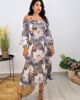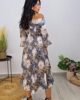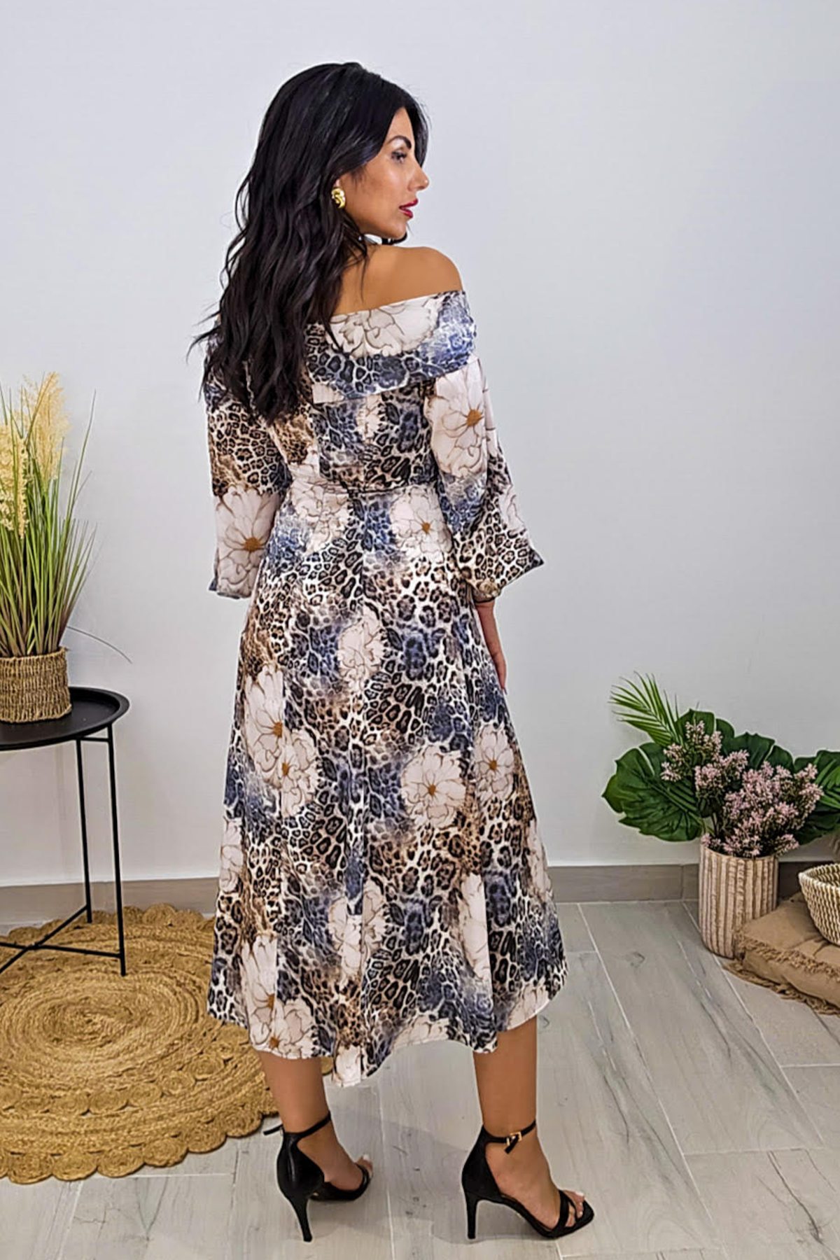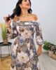 Midi φόρεμα από σταθερό σατέν εμπριμέ ύφασμα. Το φόρεμα είναι σε άνετη εφαρμογή ,στους ώμους έχει ελαστικό ζέρσεΐ ύφασμα που κατεβαίνει, κουμπώνει με φερμουάρ στην πλάτη και τα μανίκια καταλήγουν σε λάστιχο. Το προϊόν είναι ελληνικής εταιρείας.