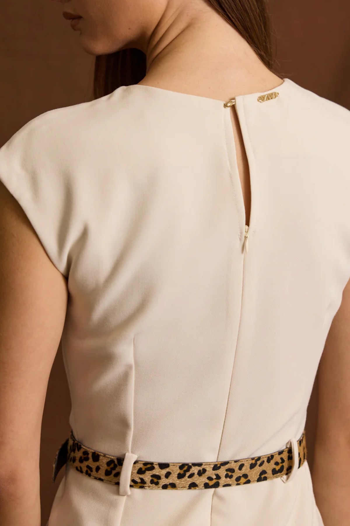Midi φόρεμα από σταθερό κρεπ ύφασμα. Το φόρεμα είναι εφαρμοστό πάνω στο σώμα με στρογγυλή λαιμόκοψη και άνοιγμα, έχει ζώνη λεοπάρ στην μέση, κλείνει με φερμουάρ στην πλάτη και κουμπί στο λαιμό. Το προϊόν είναι ελληνικής εταιρείας.