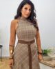 Midi φόρεμα από σταθερό καρό ύφασμα με βισκόζη. Το φόρεμα είναι ασύμμετρο με άνοιγμα στα πόδια, στενό στο πάνω μέρος και ανοίγει προς τα κάτω, έχει κλειστή λαιμόκοψη και ζώνη δερματίνη στην μέση που το κάνει πιο εντυπωσιακό. Το προιόν είναι ελληνικής εταιρείας.