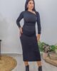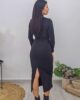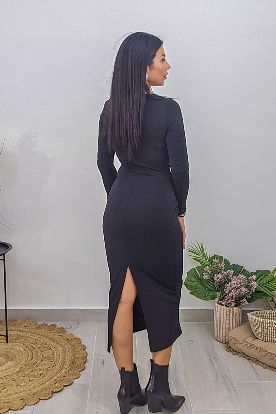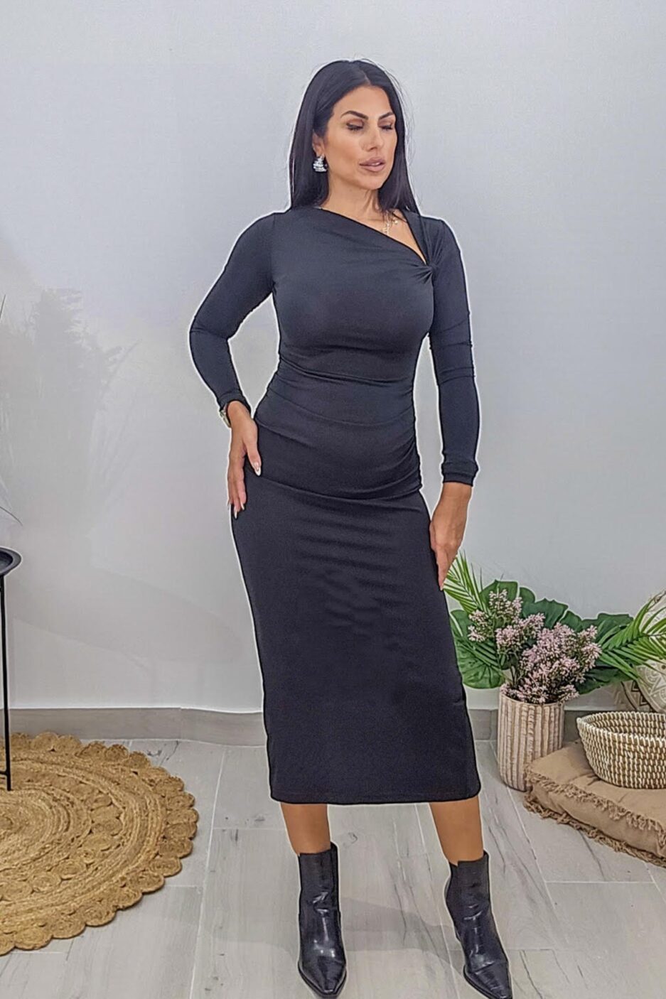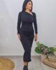 Midi φόρεμα από ελαστικό ύφασμα. Το φόρεμα είναι σε άνετη εφαρμογή έχει σούρες στην κοιλιά, μακρύ μανίκι, άνοιγμα πίσω στα πόδια και σχέδιο με κόμπο στο ντεκολτέ. Το προϊόν είναι ελληνικής εταιρείας.