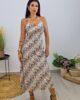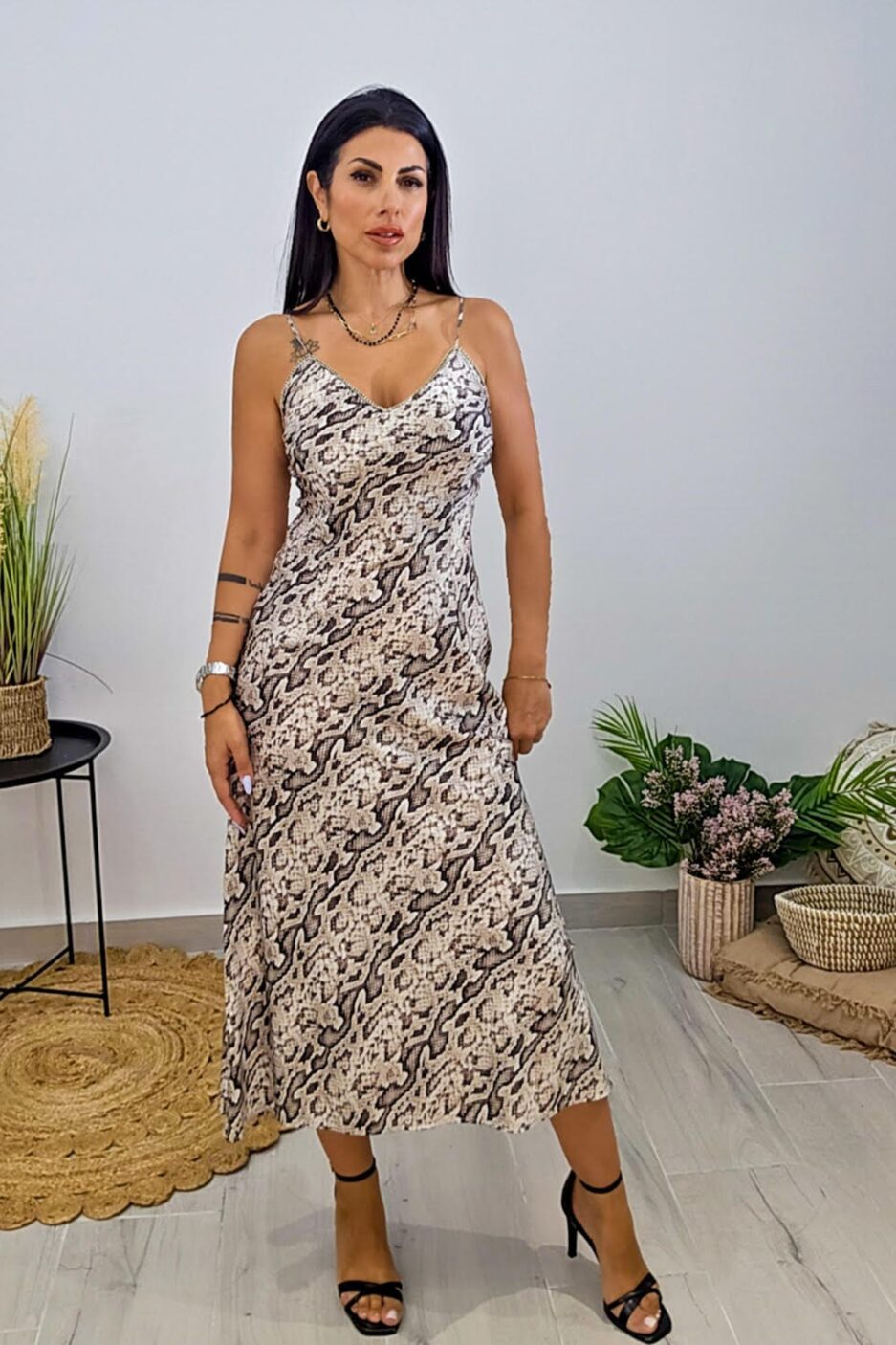 Midi φόρεμα από σταθερό σατέν ύφασμα. Το φόρεμα έχει άνετη εφαρμογή, τιράντα λεπτή που ρυθμίζεται, έχει V ντεκολτέ και είναι μεσάτο πάνω στο σώμα. Στο στήθος έχει λεπτομέρεια με αλυσίδα και στρας που το κάνει πιο ιδιαίτερο. Το προϊόν είναι ελληνικής εταιρείας.