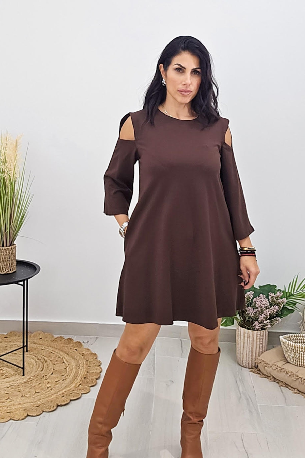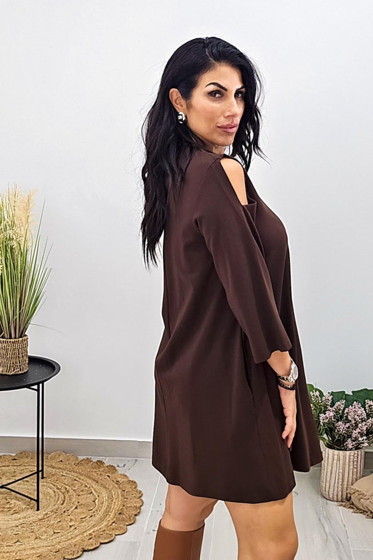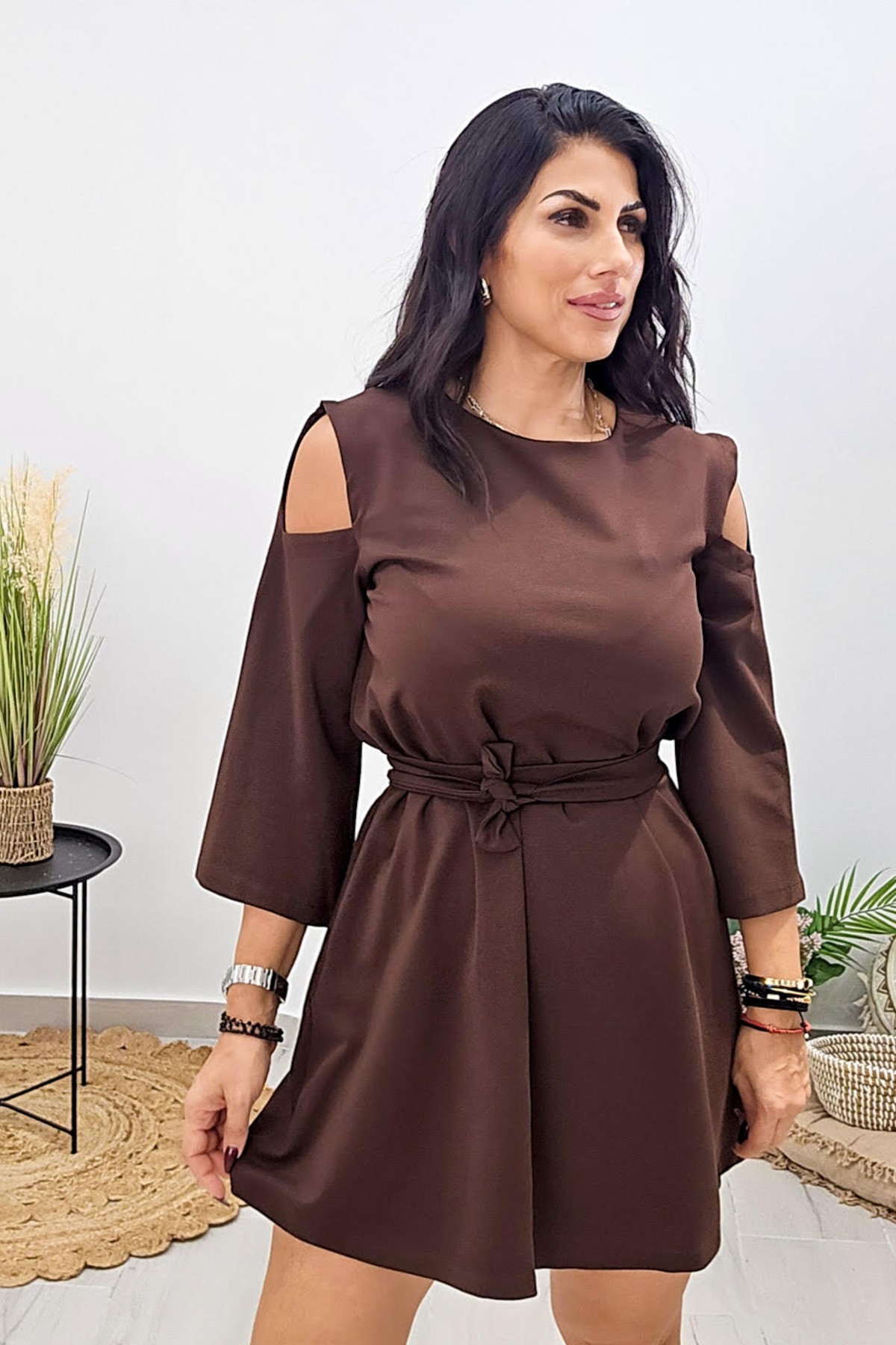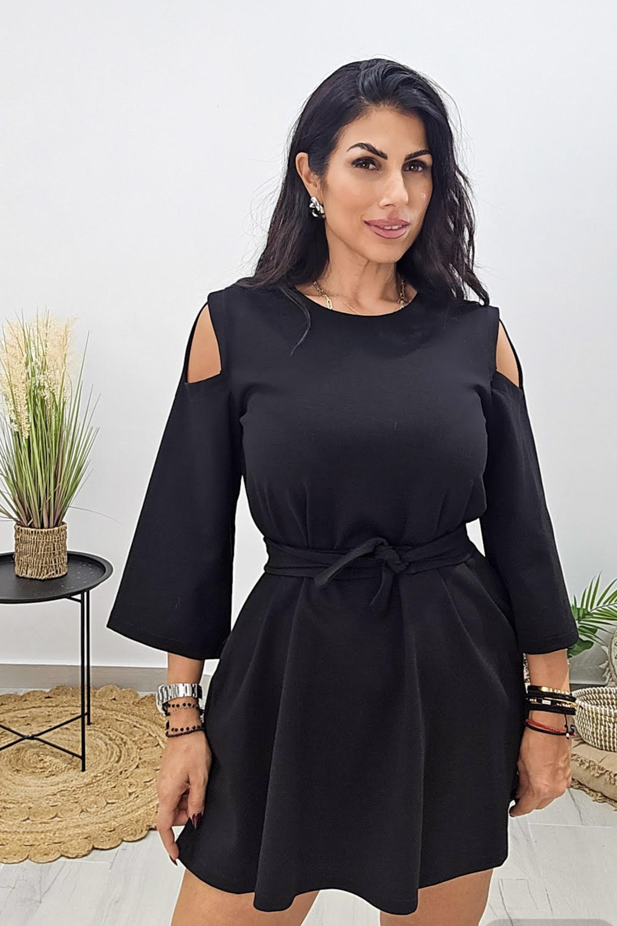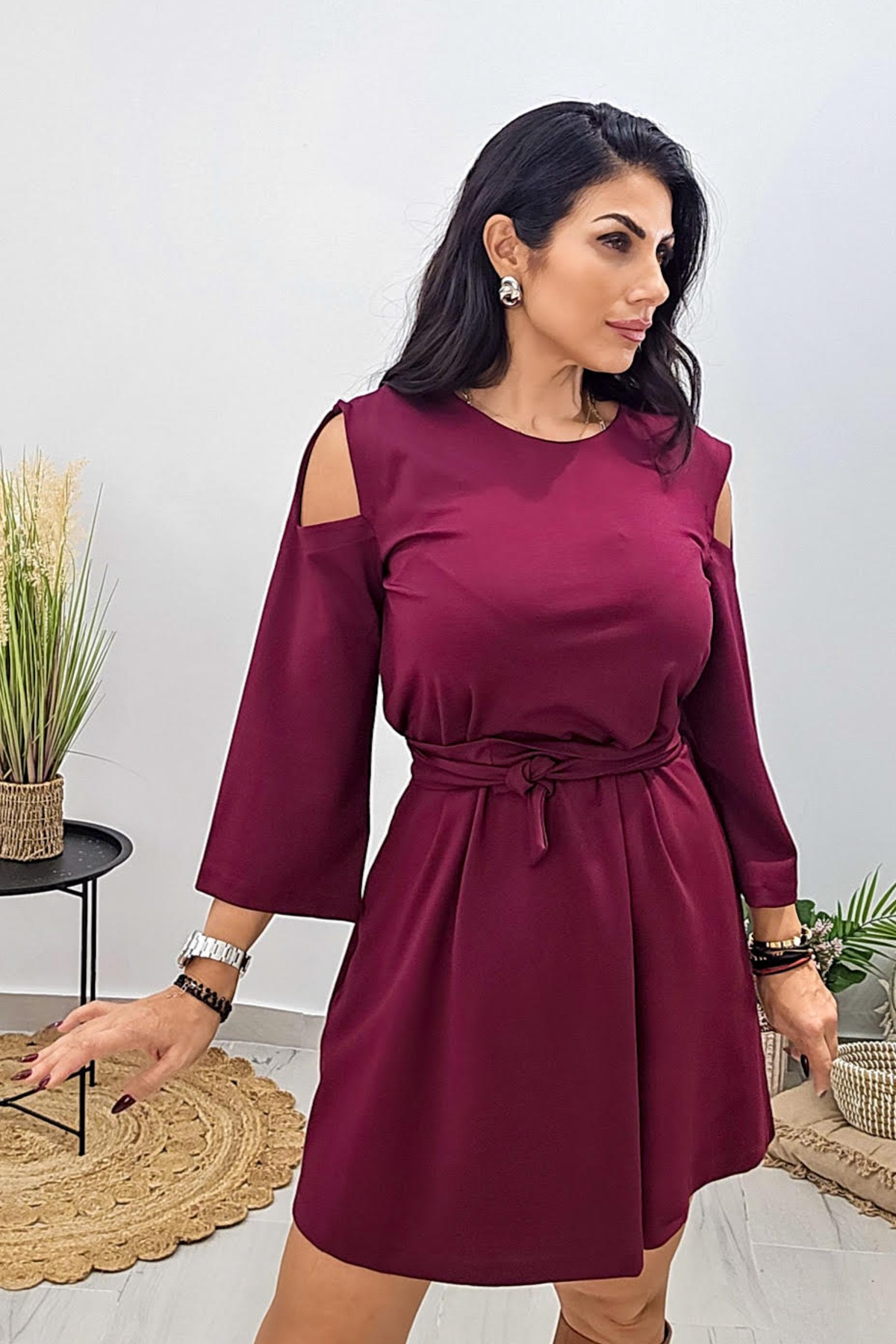 Mini φόρεμα από ελαστικό φούτερ ποντοστόφα ύφασμα. Το φόρεμα είναι σε άνετη A γραμμή με τρουακάρ μανίκι και κλειστή λαιμόκοψη. Το φόρεμα έχει λεπτομέρεια ανοίγματα στους ώμους και ζώνη στην μέση από το ίδιο ύφασμα. Το προϊόν είναι ελληνικής εταιρείας.